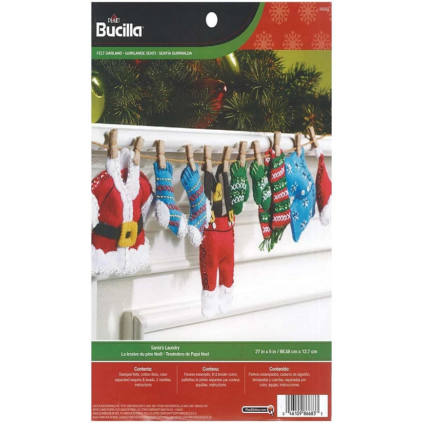Bucilla Felt Kits are really fun and unique ways to make special projects. Garland Santa’s Laundry- 27 in. x 5 in. garland features Santa’s clothing and accessories drying on a clothesline. Kit includes: stamped felts, cotton floss, color separated sequins and beads, 2 needles, and instructions.