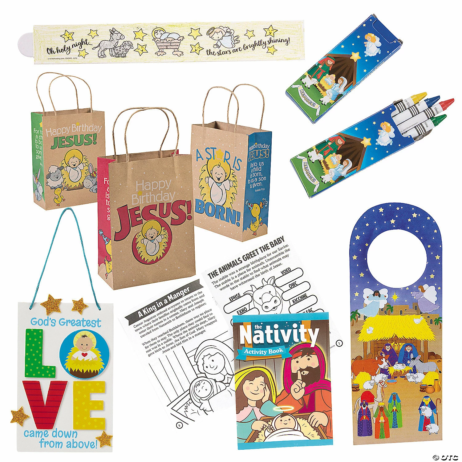 Help teach kids the real meaning of Christmas with these fun crafts! Featuring a wide variety of activities to engage their creativity, this kit has everything you need to keep young believers entertained during church services or events. (144 pcs. per unit) Assortment may vary.Includes: β’ 24 Paper Color Your Own Nativity Bracelets (Includes adhesive closure. 9″)β’ 24 Paper Happy Birthday Jesus Kraft Gift Bags (6 1/2″ x 3 1/4″ x 9″ with 4″ jute handles.)β’ 24 Love Came Down Door Hanger Craft Kits (Includes self-adhesive foam pieces and satin cording. 4 1/2″ x 7″)β’ 24 Nativity Crayon Boxes (Four assorted crayons per Nativity scene box. Safe and non-toxic. 3 1/2″ Conforms to ASTM D-4236.)β’ 24 Nativity Doorknob Hanger Sticker Scenes (Includes 12 4″ x 10 1/2″ backgrounds and 12 sticker sheets. Stickers are repositionable and acid free. Each sheet contains 72 assorted stickers.)β’ 24 Paper Nativity Learning Activity Books (5″ x 7″ 12 pgs.)