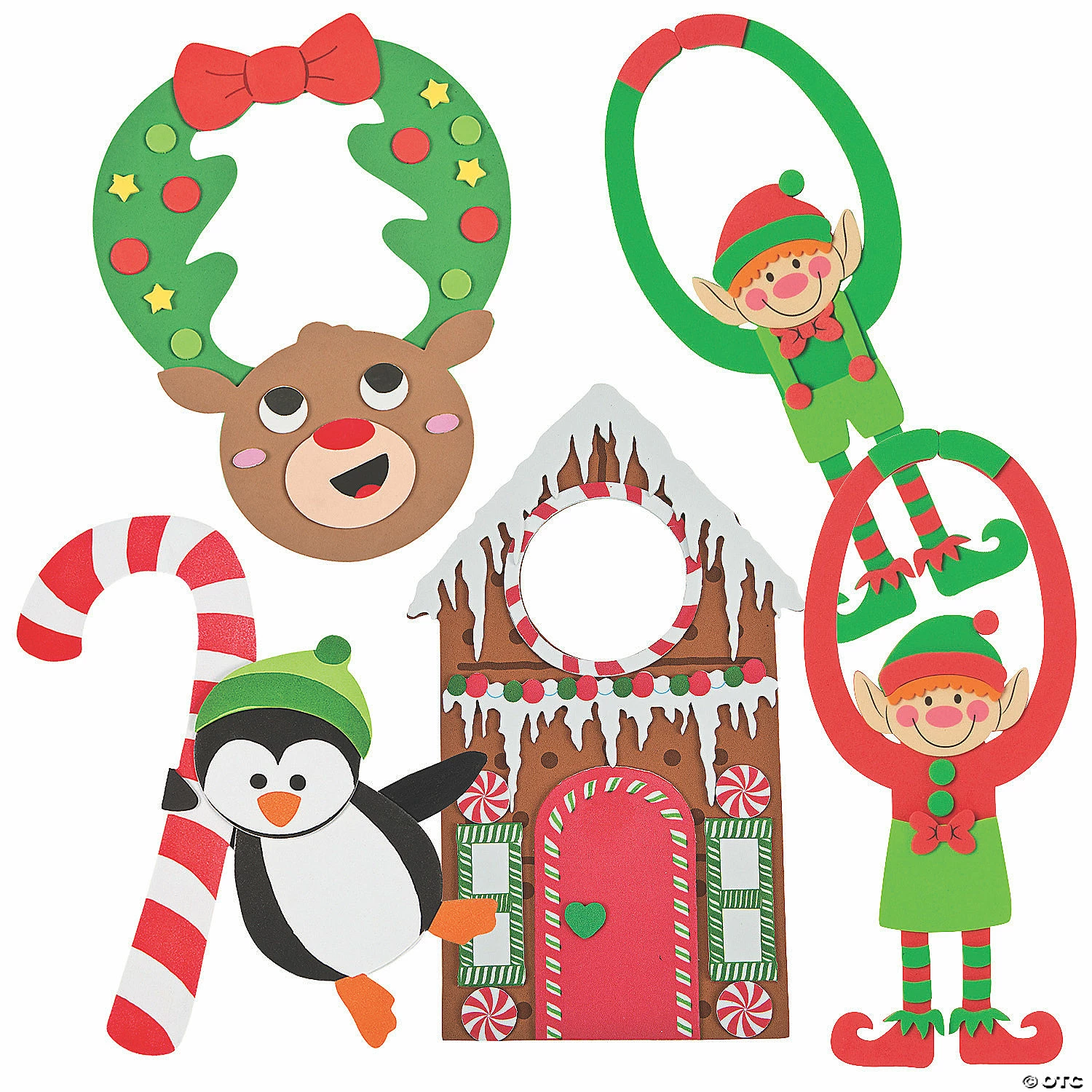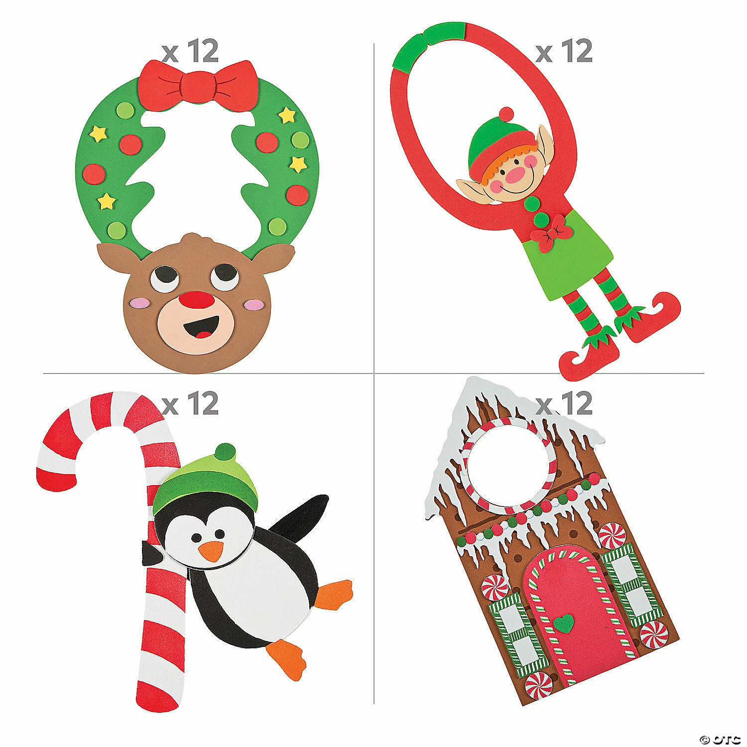 Deck the doors with elves and penguins, fa, la, la, la, la, la, la, la, la! These darling DIY Christmas decorations are a great holiday craft project for preschoolers, kindergarteners, and Sunday School students. Planning a childrenβs visit or caroling event at a senior living community? The kids can work on these easy Christmas crafts with the residents, then leave them as gifts on the doorknobs to keep the holiday spirit hanging around all season long. Includes self-adhesive foam pieces. Makes 48. All craft pieces are pre-packaged for individual use. Kits include instructions. Includes:β’ 12 Christmas Character Plate Door Hanger Craft Kits (Includes self-adhesive foam pieces, self-adhesive plastic wiggle eyes, foam pieces, polyester pom-poms, tinsel trim and paper plates. 9″ β 11 1/2″ x 9″ β 9 3/4″)β’ 12 Foam Gingerbread Doorknob Hanger Craft Kits (6″ x 10″)β’ 12 Foam Long Arm Elves Doorknob Hanger Craft Kits (4 3/4″ x 11″)β’ 12 Christmas Tree Door Hanger Craft Kits (Includes self-adhesive foam pieces. 6 3/4″ x 9 3/4″)β’ Assortments are subject to change at any time and may vary from picture shown. Substituted items will be similar in nature.