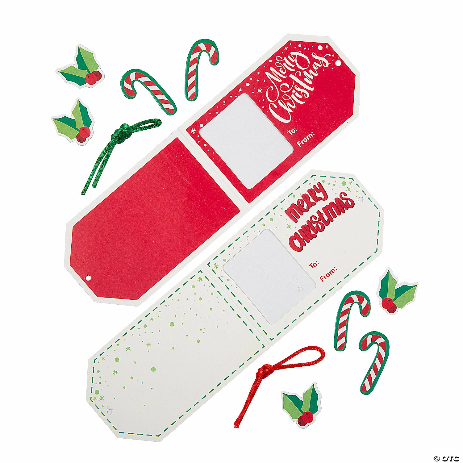 A picture is worth a thousand words and is also a great way to personalize Christmas gift tags! Kids at school, home or daycare can use these kits to create fun and festive tags that feature a space for a favorite photo. Children can attach their finished project to a present as a personal touch before giving it to a friend or family member. Includes self-adhesive foam pieces, cardstock cutouts with To/From space and satin cording. 4″ x 2 1/2″ with a 2″ photo space. Makes 12. All craft kit pieces are pre-packaged for individual use. Kits include instructions. Β© OTCChristmas Photo Frame Tag Instructions