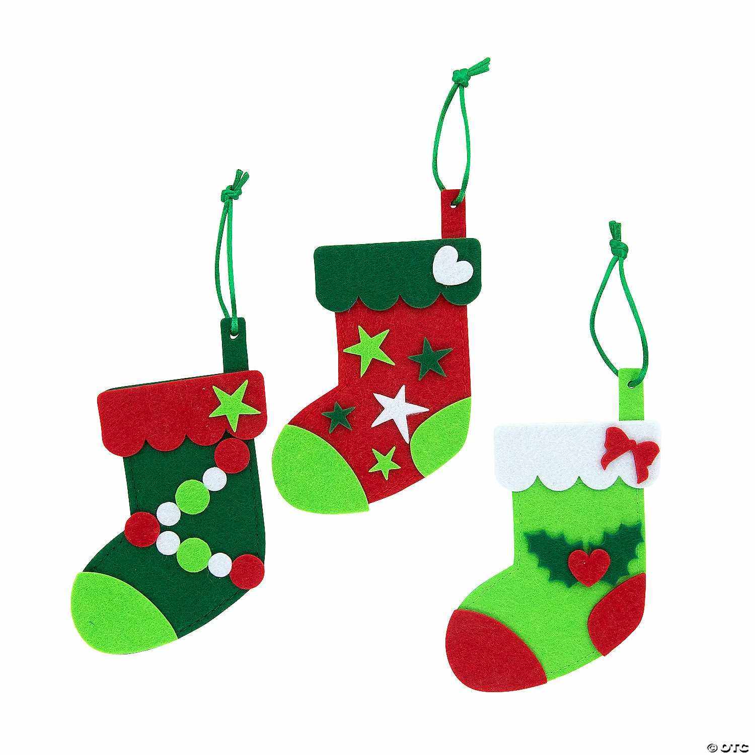 And all of the children had their stockings hanging, anxiously waiting for Christmas morning. Kids will have fun picking out their favorite stocking and assembling this Christmas craft. This is an easy activity for the classroom, daycare or during a holiday party that kids can take home to hang on their Christmas tree. Includes self-adhesive felt pieces and satin cording. 3 1/2″ x 4 1/2″ Makes 12. All craft kit pieces are pre-packaged for individual use. Kits include instructions. Β© OTCFelt Christmas Stocking Ornaments Instructions