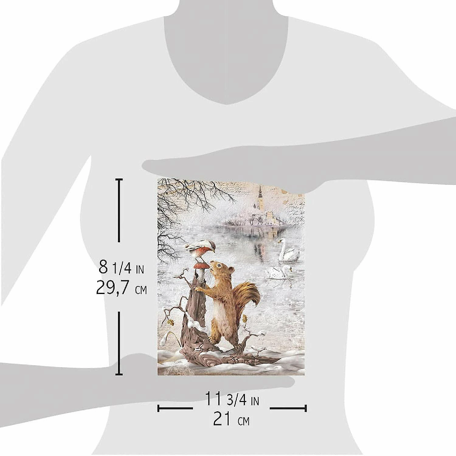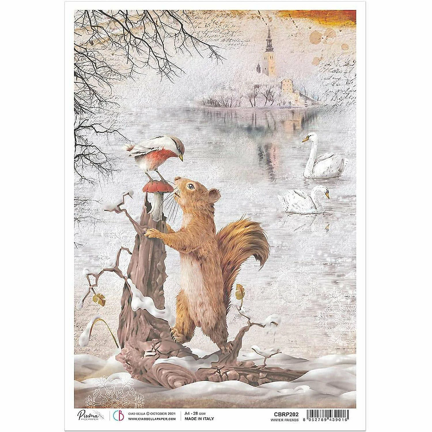 Ciao Bella Rice Paper A4 Winter Friends There are winter afternoons shrouded in mist, when itβs not totally dark yet and for a few minutes the lights shine in a particular, beautiful way, giving a unique feeling. The essence of winter. If you are lucky enough to enjoy one of those special moments, you will remember that day, keeping the memory in your heart. Gorgeous city scenes, squirrels and swans masterfully designed by our illustrators could not describe those feelings better! This collection was designed indeed with those moments full of atmosphere under the snow in mind. In its sepia, black, warm red colors shall helping you to keep your memories in any winter papercrafting projects. Piuma is the line of textured rice paper by Ciao Bella. Is an excellent paper not only for decoupage but also for mixed media and other art & craft techniques. The paper is very lightweight but strong and the printing technique, made entirely in Italy, makes it a unique product for design and quality. There is a slightly smooth side and a soft-touch side, which gives interesting results. A4 – 8 1/4×11 3/4 (21×29,7 cm) 1 design; includes image of a wintery scene with a squirrel and a winter bird with swans swimming in the background High quality rice paper 28/30 gsm Soft-touch Acid & lignin free Designed and Made in Italy