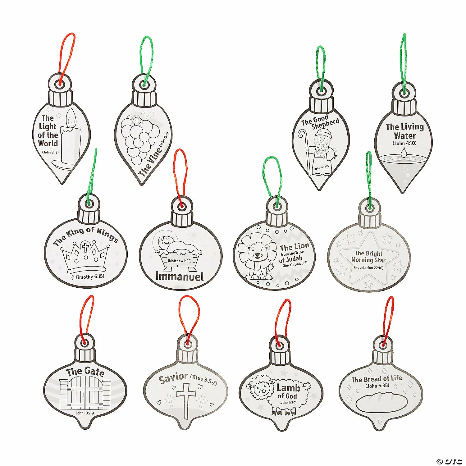 • BOOST CONFIDENCE – Completing a coloring project, big or small, will give kids a great sense of accomplishment and improve their self-esteem. They will beam with pride when they see this finished masterpiece proudly displayed at home!• DEVELOP FINE MOTOR SKILLS – Coloring involves the manipulation of small objects and requires several simultaneous actions like gripping and pressing. These physical motions help build the muscles of the fingers, hands and wrist. Working with lots of different sizes of shapes on this coloring activity will help kids build these skills and their writing over time.• SPARK IMAGINATION & PROMOTE SELF-EXPRESSION – Give your little artists’ imaginations wings with this fun coloring project. Let kids choose their colors and watch their creativity take flight!Product Description:Blend faith-learning and fun crafting with the help of these color-your-own ornaments! Kids at Sunday School, church or home can learn about the Bible’s many names for Jesus while decorating these ornaments with their favorite crayons, markers or glitter. Once finished, it will look great hanging on the Christmas tree at home. Size: 2 1/4″ – 3 1/2″ x 4″ – 4 1/2″ Quantity: 12Material: Cardstock. © OTCNames of Jesus Ornament Instructions