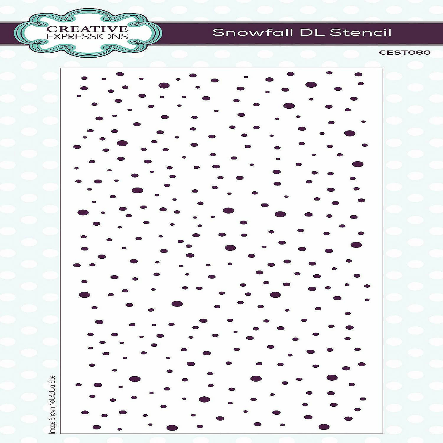 Creative Expressions Snowfall DL Stencil This stencil will make great backgrounds for cards, scrapbook pages or even for fabric! A great addition to your winter crafting stash. This stencil/mask is made from durable mylar and can be used with paint, ink, chalk, and of course the mica mists and are also a great addition to your die cutting embossing machine. Simply place the mask on your project and spray, for added effect multiple masks can be used, or re-arrange the mask and repeat with an additional colour. When finished simply wipe clean. For a different effect take a print from the mask after is has been sprayed simply spray the mask, then push paper or card over it to lift the mist. Masks can also be used to dry emboss for a more delicate effect. And for the ultimate in easy embossing use your roller die cutting machines with the necessary soft embossing mats. They are suitable for paper fabric, or any other surface depending on the ink/paint choice. Stencil size 19.7 x 8.9 cm (7.76 x 3.5 inches). Made in the UK. β’ Mix and match with the complementary stampsβ’ Create your own stylish backgrounds and decorations for your projects. Great stencil for cards, mixed media and scrapbooking.β’ Stencil size 7.76 x 3.5 inches. Made in UK