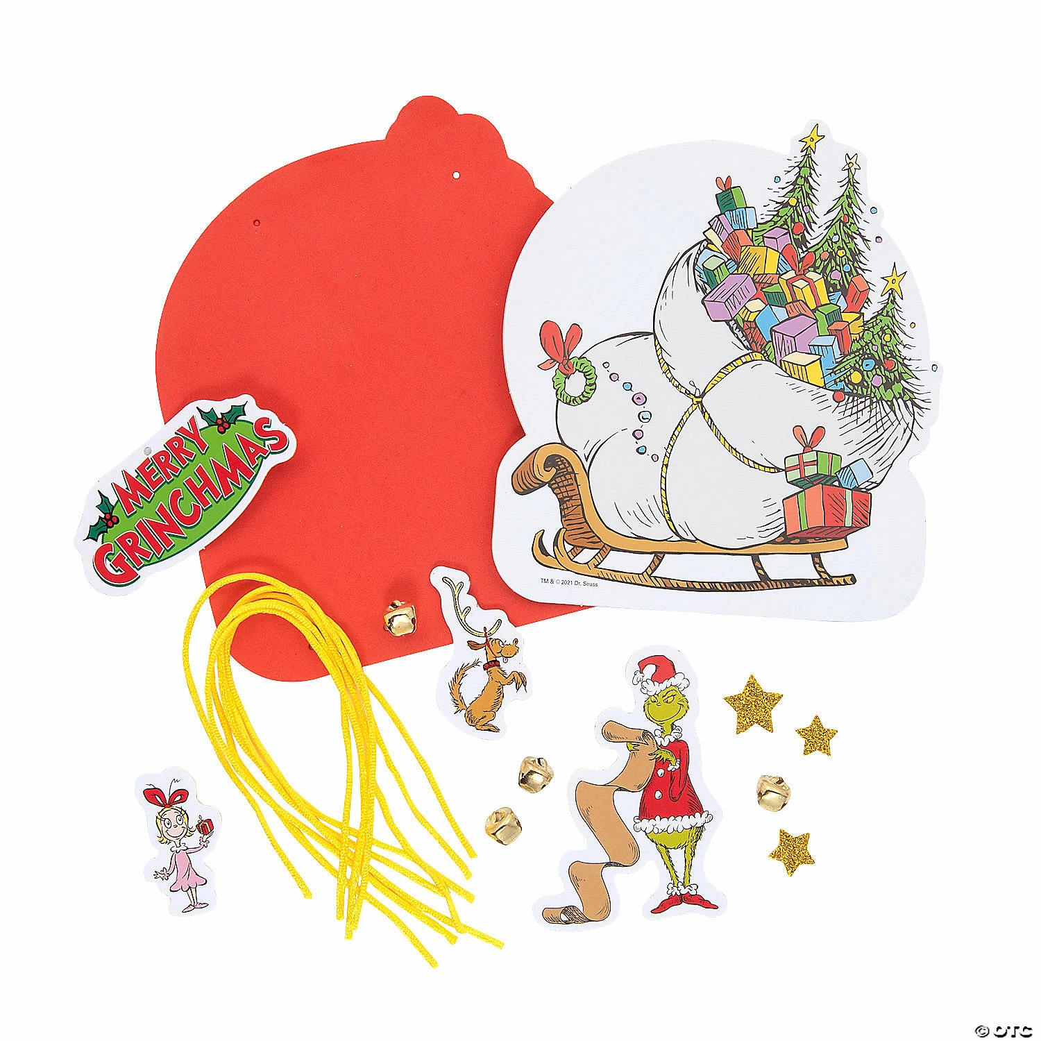 When the sneaky Grinch is near, shake these bells so all who are around can hear! Kids will have a blast assembling this craft which features the Grinch and Cindy Lou Who from the classic Christmas movie. This is a fun activity for the classroom, daycare or during a holiday party that kids can take home and hang on their front door. Includes self-adhesive foam pieces, metal jingle bells and satin cording. 7″ x 13″ Makes 12. All craft kit pieces are pre-packaged for individual use. Kits include instructions. Β© OTC / TM & Β© 2021 Dr. Seuss Enterprises, L.P. All Rights Reserved.