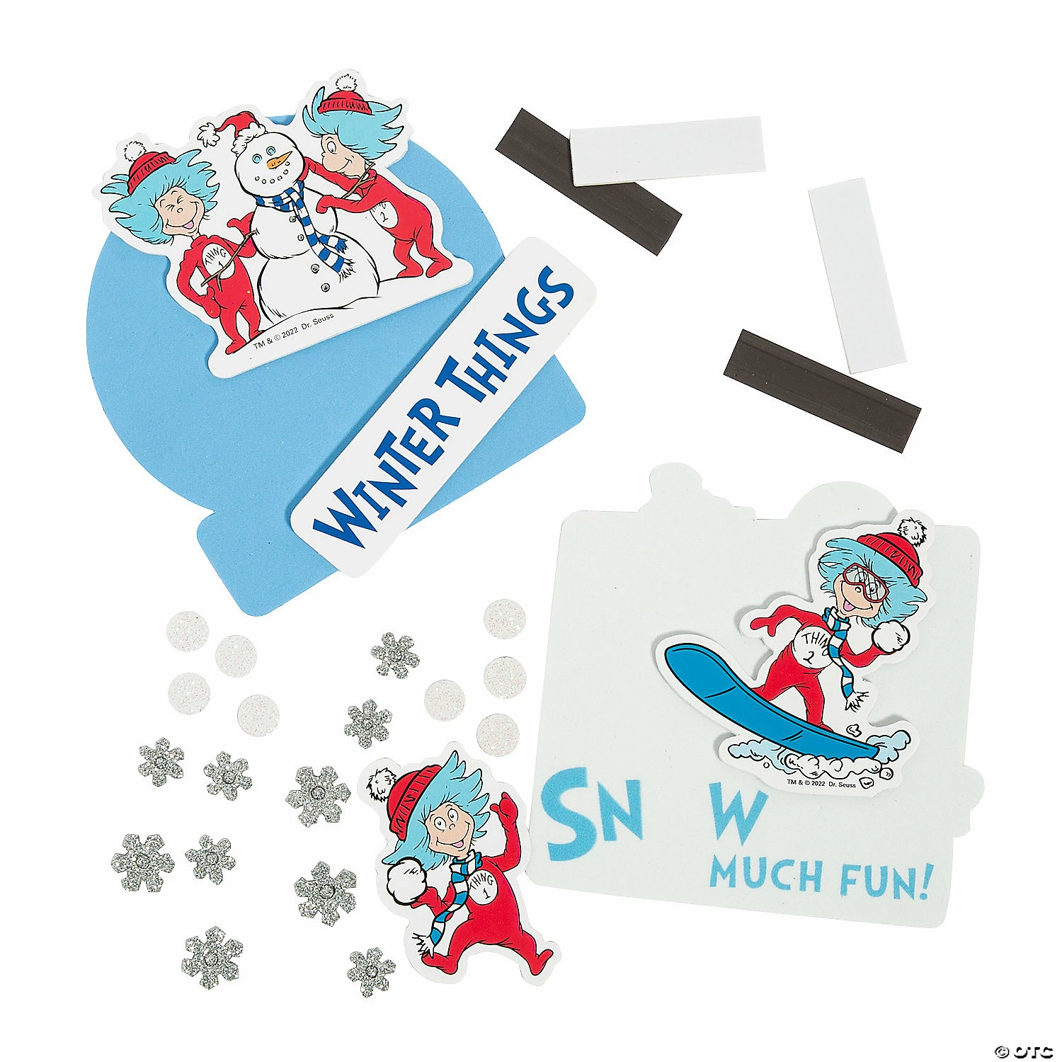 Thing 1 & Thing 2 absolutely love playing in the snow and want you to join in on the fun! These Dr. Seuss-themed craft kits are perfect for kids in school, daycare or at a Christmas party to assemble and take home to hang on their fridge. You can find more whimsical and wonderful holiday crafts on this website. Includes self-adhesive foam pieces. 3 3/4″ – 4″ x 4″ Makes 12. All craft kit pieces are pre-packaged for individual use. Magnets are packaged separately from kits. Do not discard. Kits include instructions. © OTC / TM & © 2022 Dr. Seuss Enterprises, L.P. All rights reserved.Dr. Seuss Winter Things Magnet Instructions