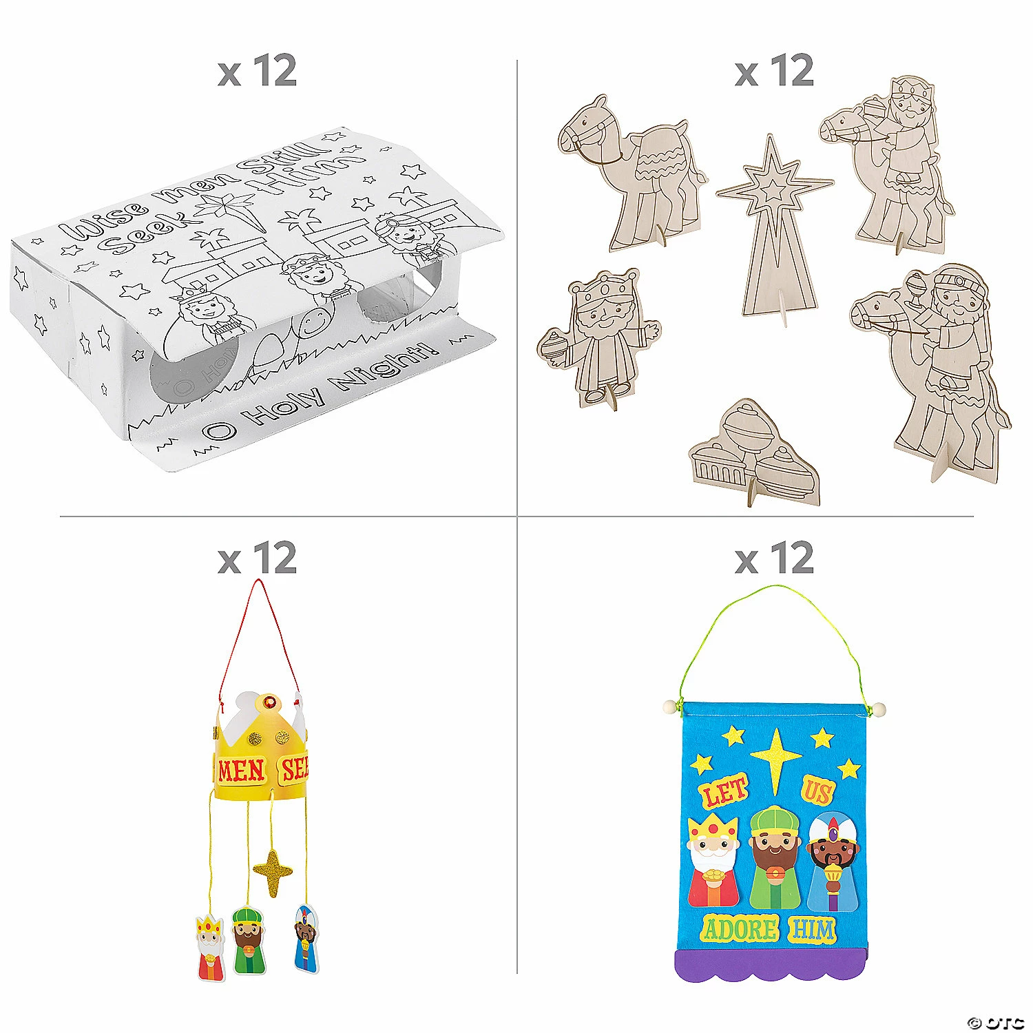 Featuring 48 fun crafts to complete, this kit can provide a craft to 48 kids or help to keep 12 children busy for hours with 4 crafts each! No matter how you use them, these crafts make a great addition to your Sunday School curriculum or holiday party activities. (48 pcs. per unit) All craft kit pieces are pre-packaged for individual use. Kits include instructions.Includes:β’ 12 Cardstock Color Your Own Wise Men Seek Him Binoculars (4″ x 2 3/4″ Simple assembly required. For novelty use only.)β’ 12 Wood Color Your Own Wisemen Playset (3 1/2″ β 4 1/2″ x 3″ – 6″)β’ 12 Epiphany Crown Mobile Craft Kits (Includes self-adhesive foam pieces, cardstock, rhinestones and satin cording for hanging. 8″)β’ 12 Epiphany Felt Banner Religious Craft Kits (Includes felt banner, self-adhesive foam pieces, wood dowel and satin cording hanger. 7-1/2″ x 10 3/4″)β’ Assortments are subject to change at any time and may vary from picture shown. Substituted items will be similar in nature.
