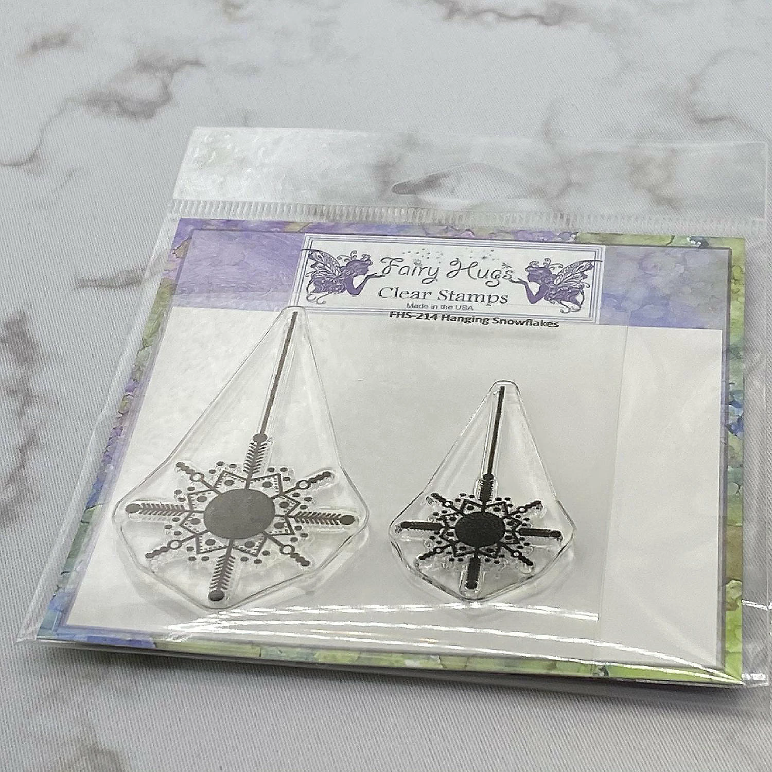 Fairy Hugs Stamps – Hanging SnowflakesIncludes 2 stamps. Large one is 1.40″ x 2.60″. Small one is 0.95″ x 1.75″.