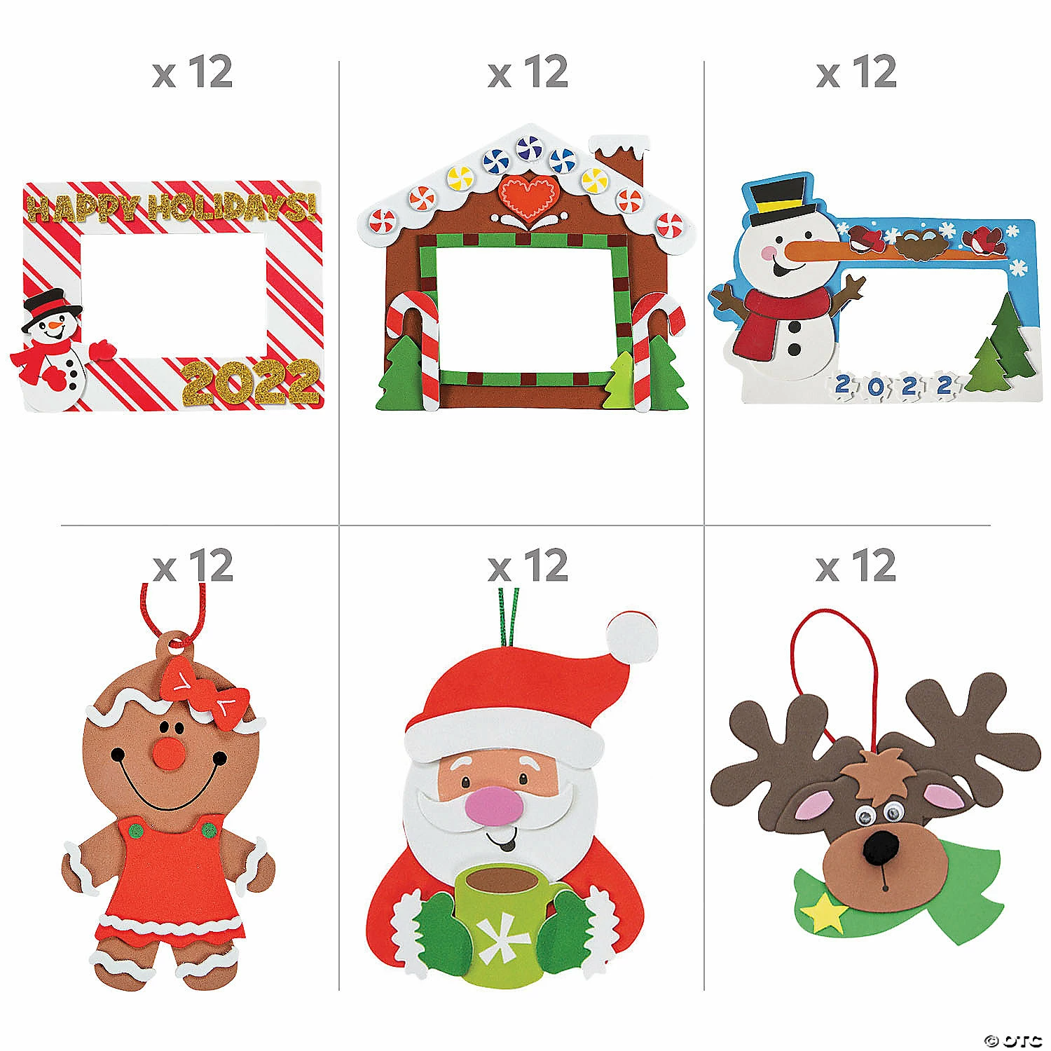Sweeten your indoor activities with this fun holiday craft assortment! Great for Christmas parties at school, home or within the community, this kit features a variety of holiday picture frames and Christmas tree ornaments to choose from. Kids will love putting these crafts together and then displaying their handiwork as part of their familyβs Christmas decorations! Makes 72. All craft kit pieces are pre-packaged for individual use. Magnets are packaged separately. Do not discard. Kits include instructions. Includes:β’ 12 Reindeer Ornament Craft Kits (Foam pieces, pom-poms, googly eyes and satin cord. 5 3/4″)β’ 12 Happy Holidays Picture Frame Magnet Craft Kits (Includes self-adhesive foam shapes. 7 1/4″ x 5 3/4″ with 4 1/2″ x 3″ photo space.)β’ 12 Dated Snowman Picture Frame Magnet Craft Kits (Includes self-adhesive foam pieces. 8 1/2″ x 6 1/4″ with a 4 1/4″ x 2 3/4″ photo space.)β’ 12 Hot Cocoa Picture Frame Magnet Craft Kit (includes self-adhesive foam pieces, pom-poms. 6 1/2″ x 8 1/4″ with a 3 1/4″ x 4 1/2″ photo space.)β’ 12 Gingerbread House Picture Frame Magnet Craft Kits (Foam. 7 1/2″ x 6 3/4″; holds a 4″ x 2 3/4″ photo.)β’ 12 Big Head Reindeer Ornament Craft Kits (Includes self-adhesive foam pieces and satin cords. 3 1/2″ x 5 1/4″)β’Β Assortments are subject to change at any time and may vary from picture shown. Substituted items will be similar in nature.