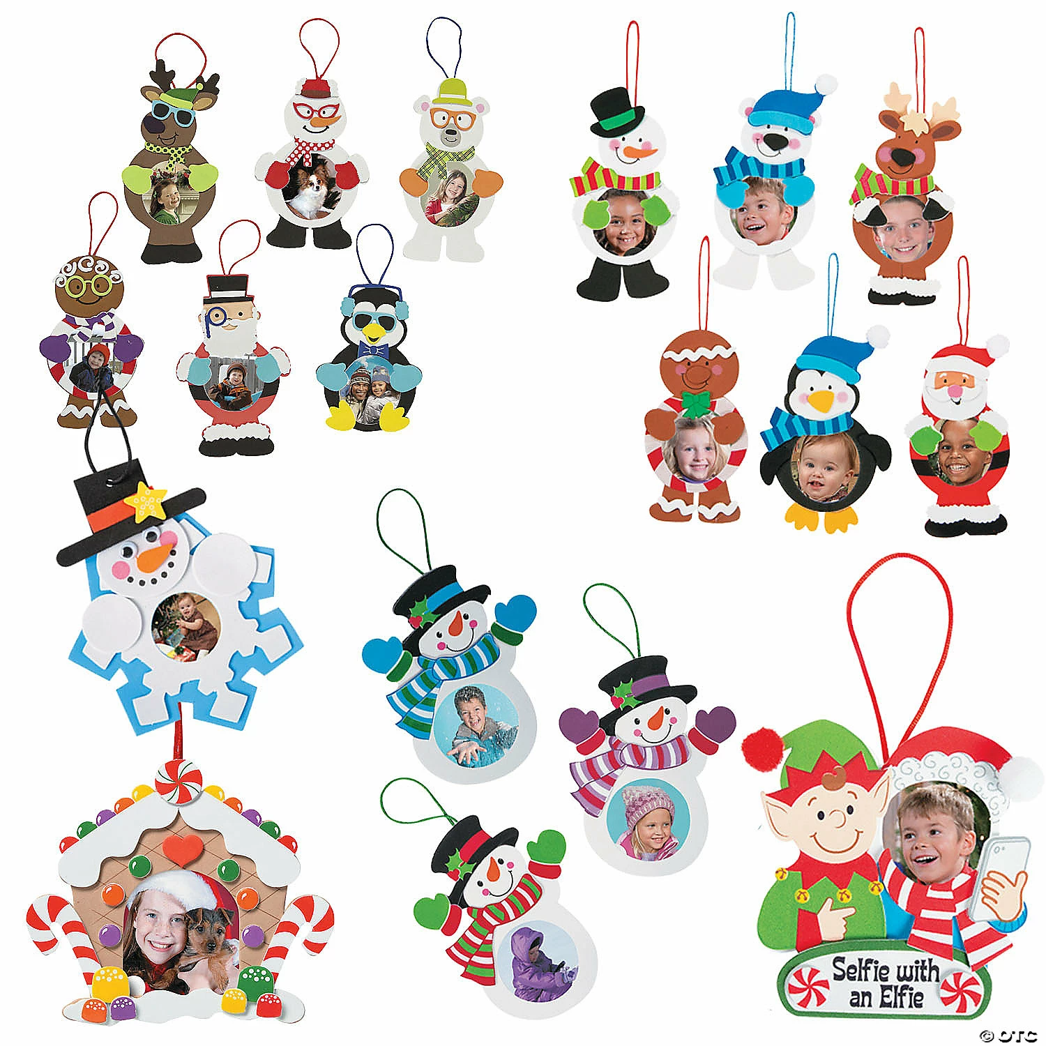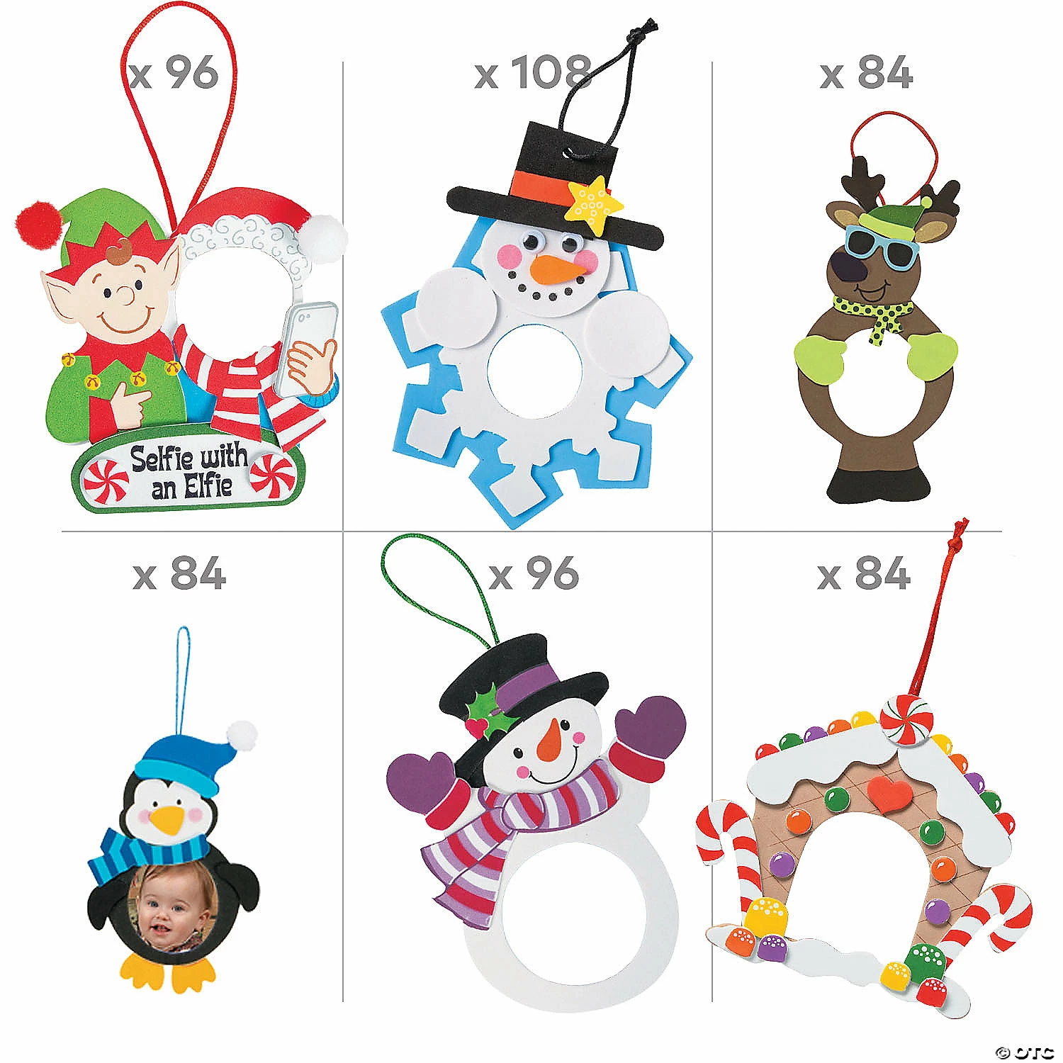 These DIY Christmas ornaments are snow much fun to make! This assortment kit is a fun kids’ activity for your school Christmas parties or community holiday event, and the finished products make great Christmas gifts for parents, grandparents and other loved ones. Families will treasure these Christmas decorations for many years to come! Assortment may vary. Makes 504. All craft kit pieces are pre-packaged for individual use. Kits include instructions. © OTCIncludes:• 84 Christmas Character Picture Frame Ornament Craft Kits (Includes self-adhesive foam pieces for creating 6 colorful Christmas ornaments: a snowman, polar bear, reindeer, gingerbread man, penguin and Santa Claus. 6 1/2″ – 7 1/2″ with a 2 3/4″ photo space.)• 84 Silly Christmas Character Picture Frame Ornament Craft Kits (Includes self-adhesive foam pieces and satin cording. 3 3/4″ – 4 1/2″ x 5 3/4″ – 7 1/2″ with a 1 1/2″ x 1 3/4″ photo space.)• 84 Foam Elfie Selfie Picture Frame Ornament Craft Kits (Includes self-adhesive foam pieces and satin cord. 5 1/2″ x 4 3/4″ with 2″ photo space.)• 84 Snowman Picture Frame Ornament Craft Kits (Includes foam self-adhesive pieces and satin cord for hanging. Approx. 5″ x 6 1/2″ with a 2 1/4″ diam. photo space.)• 84 Snow Globe Photo Ornament Craft Kits (Includes self-adhesive foam pieces, satin cording and plastic. 3 3/4″ x 4 3/4″ with 2 1/2″ x 2 1/2″ photo space.)• 84 Foam Snowman & Snowflake Picture Frame Ornament Craft Kits (Glue is required; sold separately. 6 1/2″ with a 1 1/2″ photo space.)• Assortments are subject to change at any time and may vary from picture shown. Substituted items will be similar in nature.