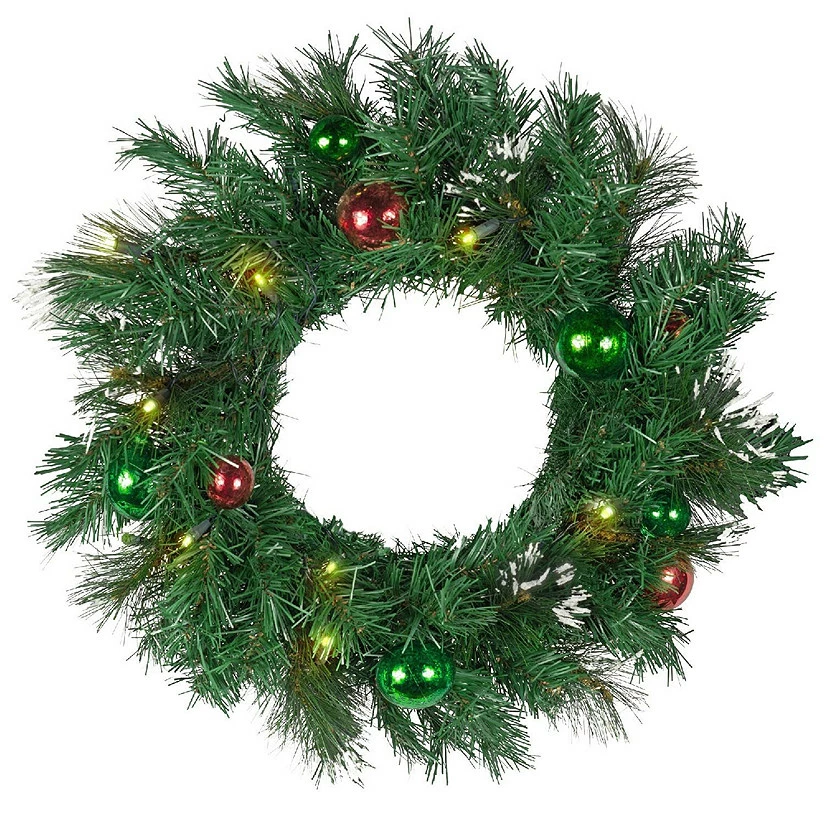 Holiday Wonderlands Artificial Lighted wreath is a beautiful decoration that will show off your holiday cheer in a classic and timeless design. 24-inch diameter x 6-inch height. Luscious dark green artificial mixed pine wreath. Adorned with 30 battery-operated warm white lights. Decorated with red and green old fashioned mercury ornaments that are also lit. Batteries run on timer and last up to 576 hours. 6 hours ON, 18 hours OFF and Repeat. Uses 2 D batteries not included. Easy to hang up, looks great in various locations. Whether it is hung on your door, above your mantle or outside, this festive wreath looks fantastic in any location! The lush dark green artificial pine is adorned with 30 battery operated warm white lights for that extra holiday twinkle. The wreath contains faux snow and red and green old fashioned mercury ornaments that are also lit. The batteries run on timer and last up to 576 hours. They vary by 6 hours on, then 18 hours off. It then repeats multiple times. Uses 2 D batteries, which are not included. Wreaths are a quick and easy decoration to spread holiday cheer around your home! You can use them in a traditional sense by hanging them on walls, doors, over the fire place. Or, you can get creative! Find a special place in your home to show off this beautiful artificial pine wreath.
