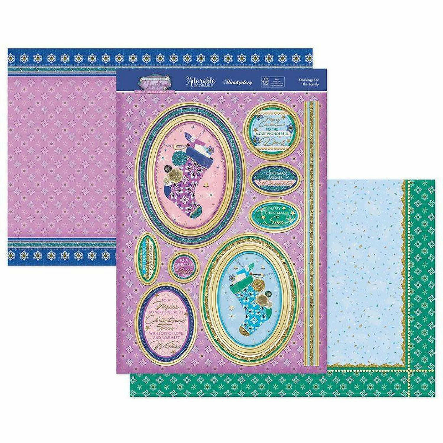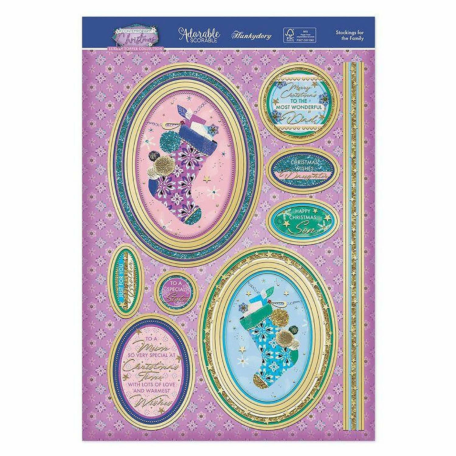 Stockings for the Family Luxury Topper Set Get ready to hang up your Christmas stocking with the Stockings for the Family Topper Set. This gorgeous set features a blue and purple stocking filled with gifts and covered with decorations on a twinkling background. The sparkling borders, rich gold foil and heart-warming sentiments add to the beauty of the festive imagery. This set is perfect for personalising a sweet stocking themed card for your family to enjoy. Foil: Gold Die Cut Elements: 13 Colours: Sky Blue, Violet Purple, Pink Lavender, Teal Green, Gold Occasion: Christmas Theme: Christmas, Stocking, Gifts, Stars Sentiments include: βMerry Christmas to the Most Wonderful Dadβ, βChristmas Wishes Daughterβ, βHappy Christmas Sonβ, βJust For You Brotherβ, βTo a Special Sisterβ, and βTo a Mum, So Very Special at Christmas Time, With Lots of Love and Warmest Wishesβ. Christmas has had a makeover with the Contemporary Christmas Collection. The Collection features stylised artwork of reindeer, swans, doves, chic baubles, mistletoe and more in an elegant and modernised style. The dazzling array of rose gold, silver and gold foil accentuates the stylish artwork and contemporary colourways. Make Christmas fashionable with this collection and create polished modern Christmas cards and projects. Includes a gold foiled Topper sheet, foiled cardstock sheet and printed cardstock sheet Features colouring Christmas stockings Elegant themed, contemporary festive artwork Includes 13 die-cut elements Makes at least 2 cards