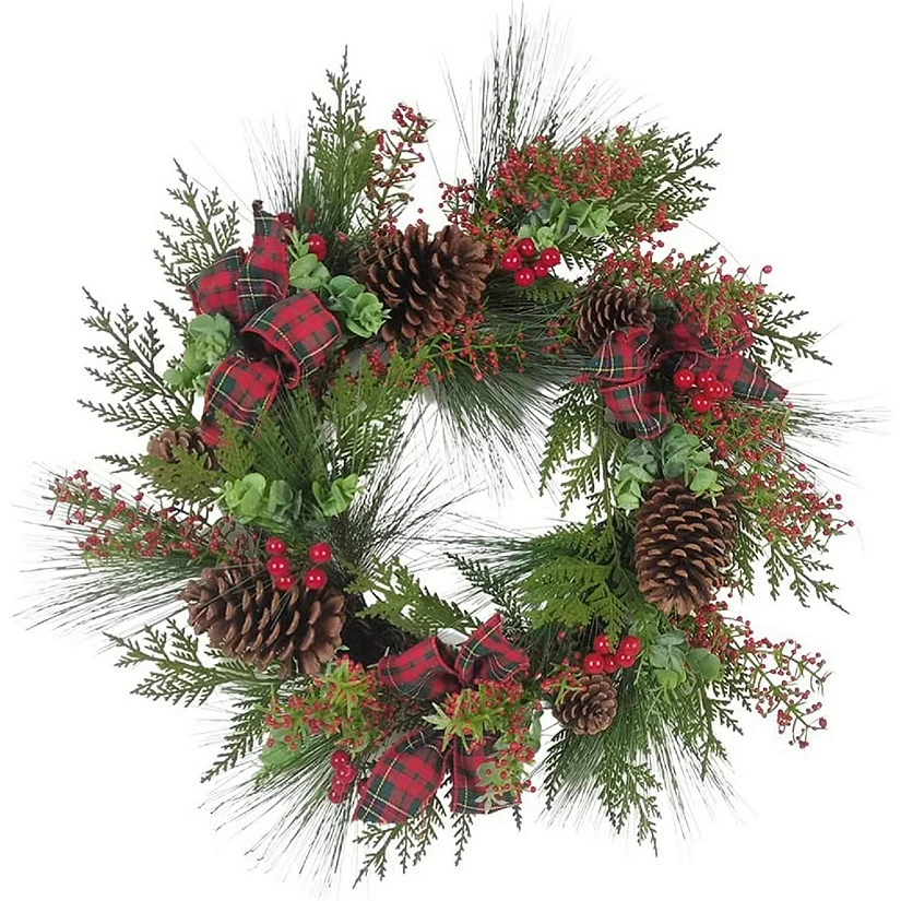 Wreaths are a beautiful way to adorn your home for the holidays! For both indoor and outdoor use, when under a covered porch Lightweight design allows for simple mounting Measures 24 x 24 x 6 LWH inches This artificial wreath has a thick, round, design that pairs well with many other holiday decor themes Detailed with a plaid bow Made of plastic, rattan, polyester, styrofoam, pinecone and metal to provide a realistic appearance This rattan wreath with faux greens, berries, pinecones and ribbon from Kurt Adler is a beautifully unique addition to your winter or holiday decor. This wreath is decorated for a festive touch. A quick and easy way to bring holiday cheer to your home!