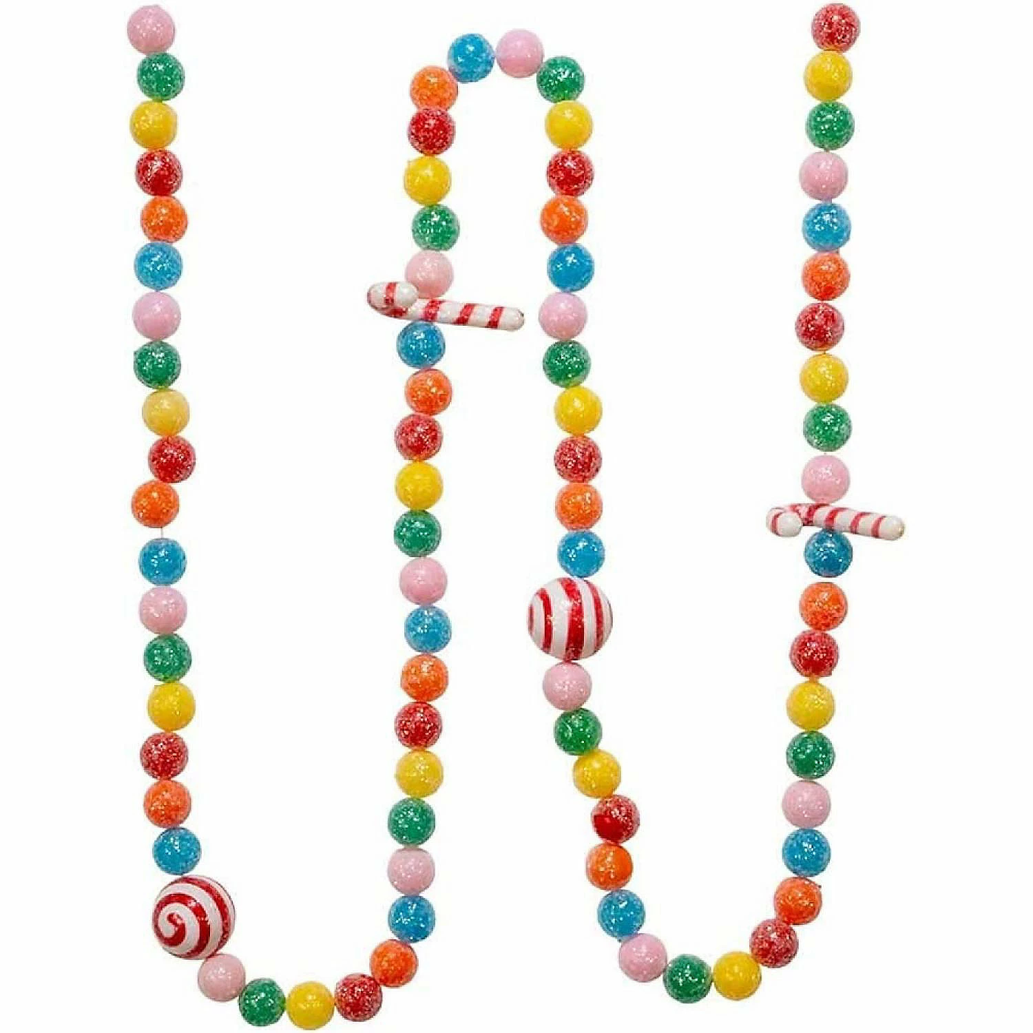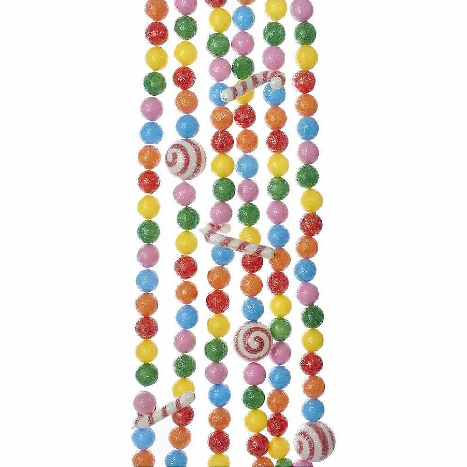 A personalized way to decorate your tree this Christmas. Measures 6-feet long. A sweet addition to any holiday or themed party dandeacutecor. Brand new in original packaging. Made of plastic. This 6-Foot Candy Cane and Candy Ball Garland by Kurt Adler is a fun, quirky way to add to your holiday dandeacutecor! Each piece on this garland resembles a round piece of multicolored candy, red and white peppermint candies and red and white candy canes. Each candy on this garland has a realistic sugar coating and there is no spacing between each candy piece.