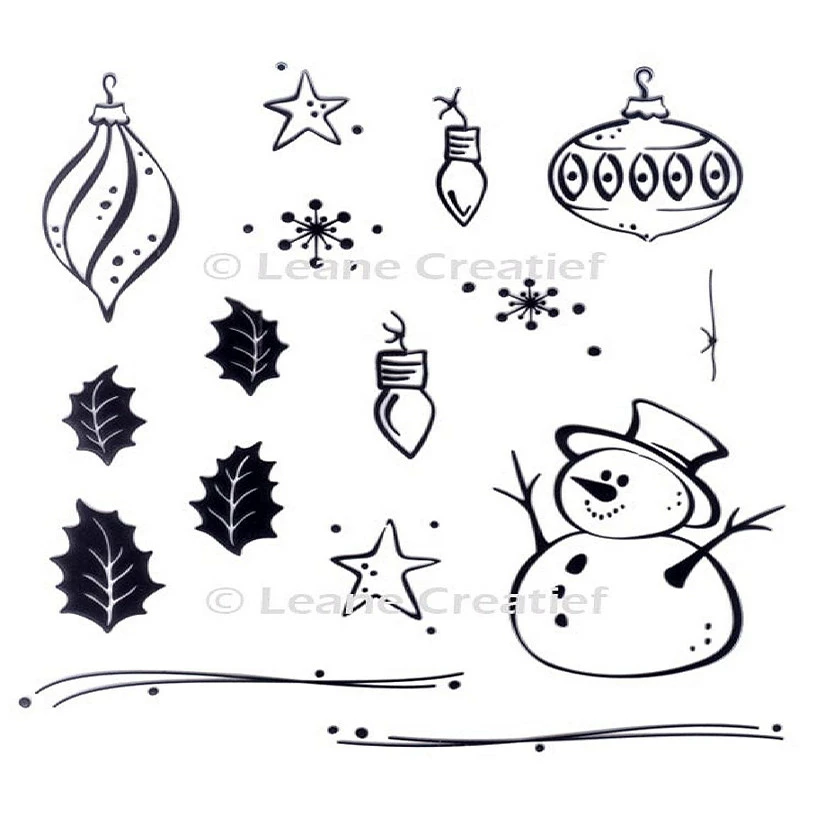 LeCreaDesignยฎ clear stamp Holidays. A great stamp set with all the necessities for Winter/Christmas including a snowman, ornaments, snowflakes, lights, stars and leaves.16 stamps.Sizes:Smallest: 0.60″ x 0.30″ Largest: 1.10″ x 1.40″
