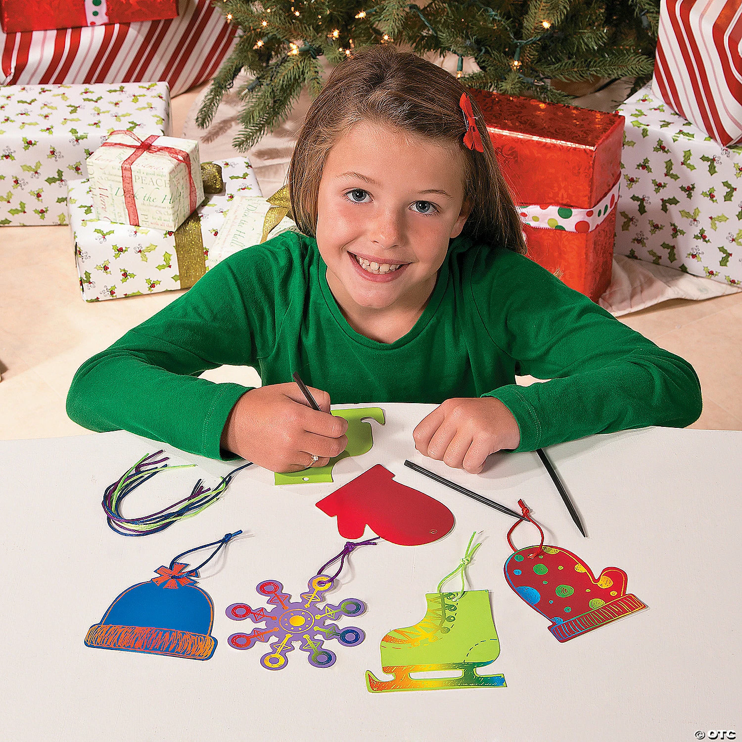 Magic Color Scratch Winter Christmas Ornaments. Create your own message or design on these winter shapes! Includes snowflakes, hats, mittens and ice skate shapes. (24 paper shapes, 12 scratching tools and 24 satin ribbons per unit) 4″ – 4 1/4″ Β© OTC