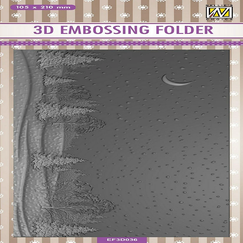 Nellie’s Choice 3D Embossing Folder Slimline Size – Snowy Landscape 105x210mm This snowy tree lined landscape with a crescent moon Slimline Sized 3D Embossing Folder can be used with most major die cutting machines to produce a deep and intricate embossed effect with different levels of embossing for even more visual interest and then can be embellished with ink, paint or other mediums. Size: 105x210mm. Size: 4.1 x 8.3 inches.