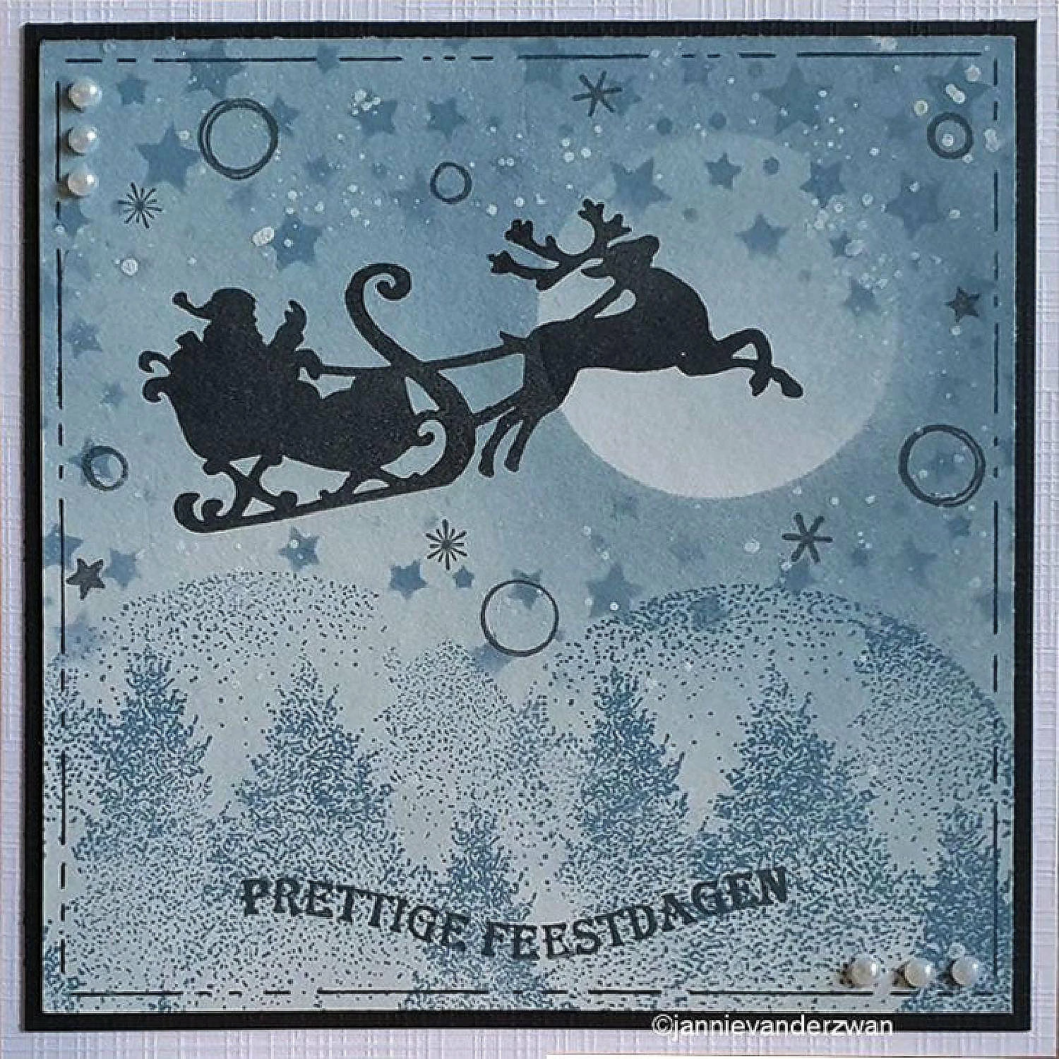 Nellie’s Choice Clear Stamp Silhouette Santa Claus with Reindeer Sleight A silhouette of Santa flying in his sleigh. Great for Christmas cards. Size: 8.6 x 3.3 inches.