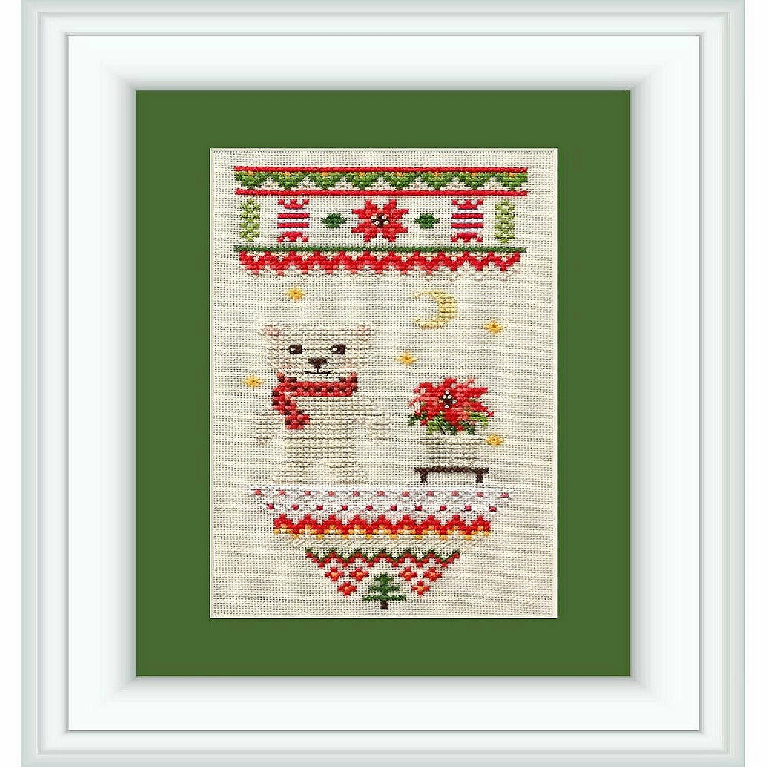 Christmas sampler cross stitch kit. Includes white polar bear with red flowers and other shapes. It is simple and minimalistic design with quality materials.