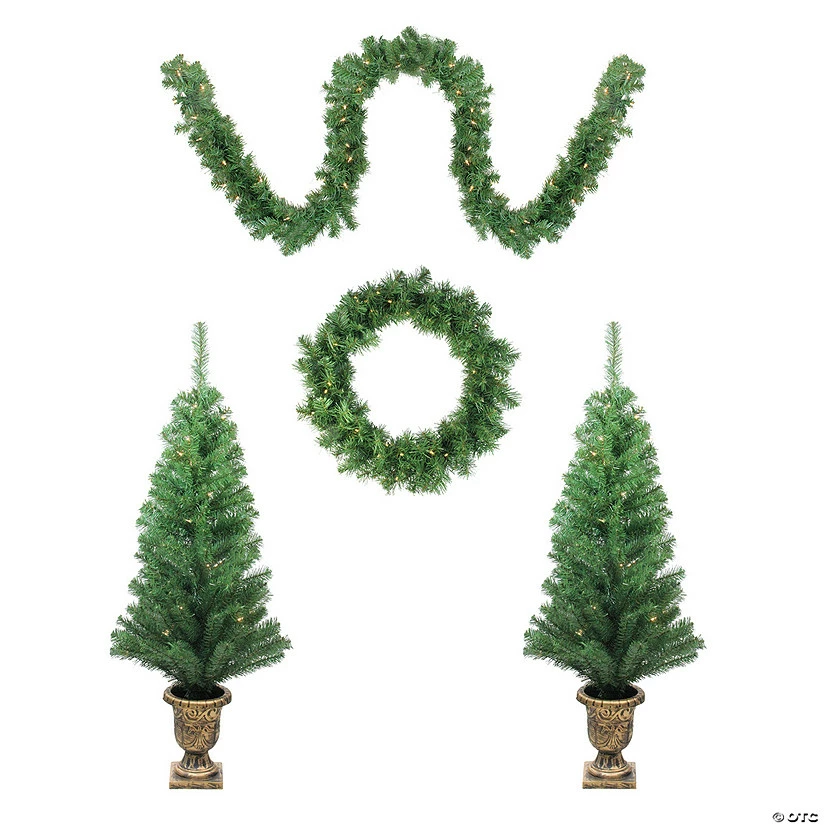 “Add some refreshing holiday cheer to brighten your festivities with this fascinating artificial tree.Tree: Pre-lit with 50 clear lights. Slim profile tree 3-piece easy assembly. Comes in a decorative brushed gold pot. Wire gauge: 22 120 volts . Garland: Pre-lit with 50 clear lights. Bendable wire center to shape the garland any way you desire Green metal hooks on each end for easy hanging. Contains end-to-end connectors to connect more than 1 garland together (not to exceed 210 watts) Wire gauge: 22 120 volts. Wreath: Pre-lit with 35 warm white LED lights Bulb size: micro wide angle. Includes a metal frame backing for hanging. Requires (3) “”AA”” size batteries – not included. Automatic timer function with 8 hours on 16 hours off. Additional Product Features: Light sets on tree are UL certified and approved for indoor or outdoor use however the set itself is recommended for indoor use or outdoors under a covered area. Lights on the tree and garland are equipped with Lamp Lock feature which makes them replaceable interchangeable and keeps them from falling out Lights on the wreath are non-replaceable Comes with replacement bulbs and spare fuses for the tree and garlands Dimensions: Tree: 4′ high (from the base of the stand to the top of the tree) Garlands: 9′ long x 10″” wide Wreath: 24″” diameter (measured from outermost tip to outermost tip across the wreath) Material(s): PVC/metal/glass/plastic/wireNote: Branches are compressed for shipment and need to be fluffed out upon arrival to look like the photo. Special Shipping Information: This item ships separately from other items in your order. This item cannot ship to a P.O. Box. This item may be subject to additional processing days. Item is not eligible for expedited shipping. You may initiate a return for unused items within 30 days, if the items are in original packaging with all original materials included with the shipment.”