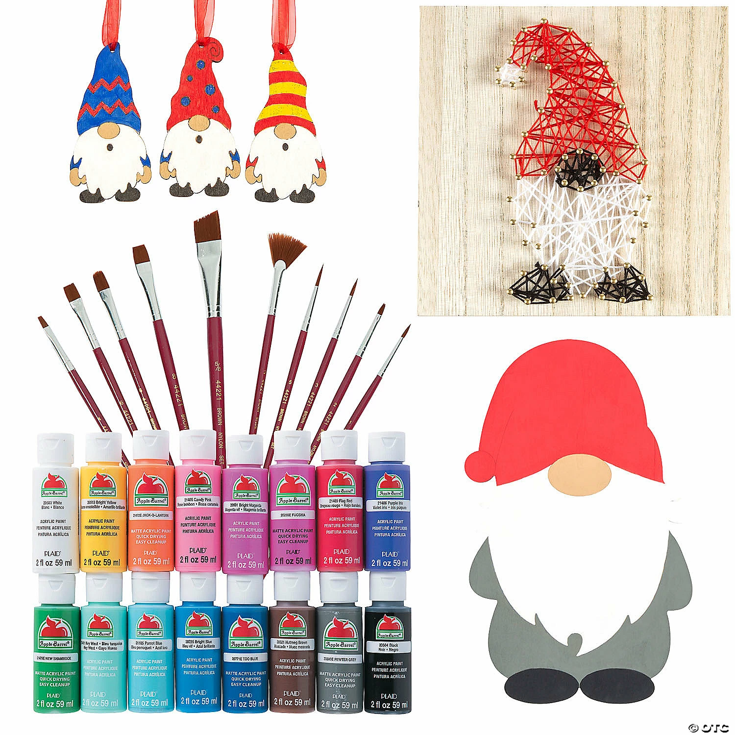 Make your house โgnome sweet gnomeโ with these unique home decorations that you design yourself! Makes a great craft activity for when youโre having a craft night in alone or chillinโ with your gnomies and looking for something fun to do. Break out the included paints and accessories and get to work! (40 pcs. per unit) Assortment may vary.Includes:โข 16-Pc. Apple Barrelยฎ Acrylic Paint Assortment (Safe and non-toxic. 3 3/4″ 2-oz. Conforms to ASTM D-4236.)โข 1 Wood Gnome String Art Craft (Includes 3 colors of string. 5 3/4″ x 5 3/4″)โข 12 Wood Color Your Own Gnome Ornaments (Includes jute cording. 2″ x 4″)โข 1 DIY Unfinished Wood Gnome Cutout (11 1/4″ x 18″)โข 10 Wood Plaidยฎ Brown Nylon Paintbrushes (6 7/8″ – 7 7/8″)โข Assortments are subject to change at any time and may vary from picture shown. Substituted items will be similar in nature.