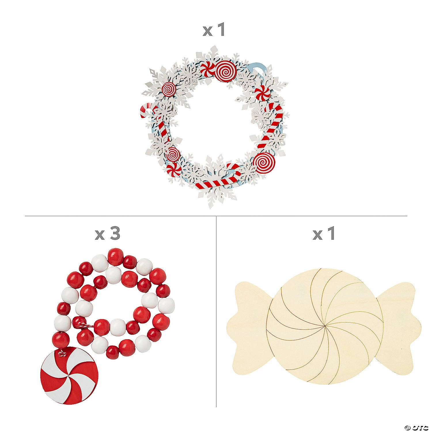 Add a minty feeling to your holiday decorations with these adult craft kits. Featuring peppermint-themed DIY projects, this kit of home decorations allows you to put your own style into creating some pieces that will enhance your holiday party space. (5 pcs. per unit)Includes:β’ 1 DIY Unfinished Wood Peppermint Candy Sign (15β x 9β)β’ 1 Candy Cane & Snowflake Wreath Craft Kit (18β Includes cardstock, chipboard and self-adhesive foam pieces. Kits include instructions.)β’ 3 Holiday Peppermint Wooden Bead Garland Craft Kits (24β Includes wooden beads and cotton thread. Kits include instructions.)β’ Assortments are subject to change at any time and may vary from picture shown. Substituted items will be similar in nature.