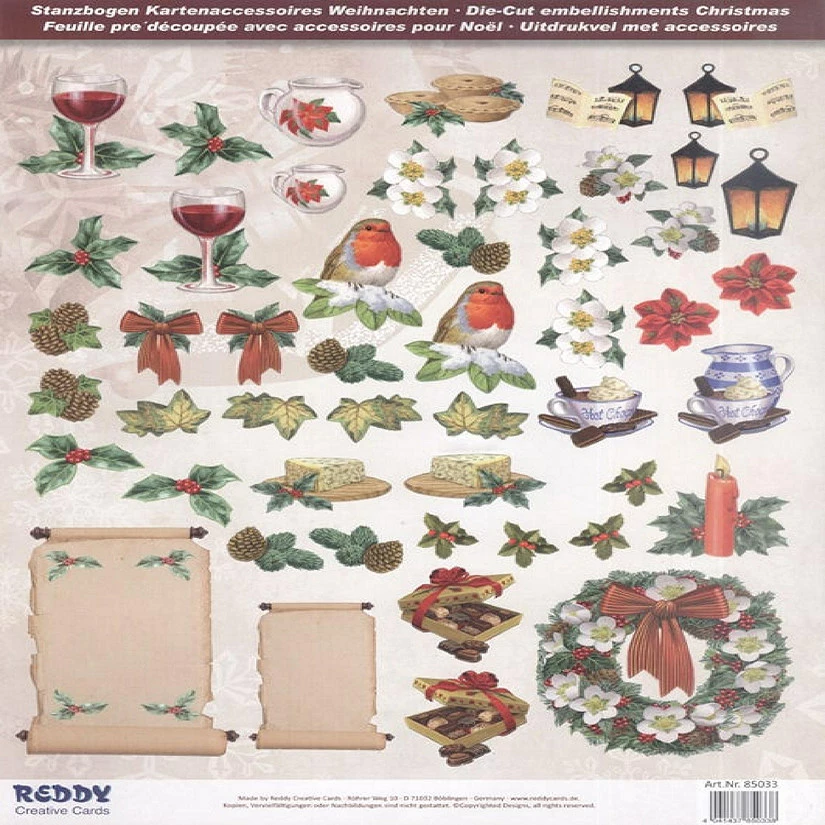 Pre Cut Christmas Cheer Die-cut embellishments for your Christmas cards that include wine, cheese and chocolate. Also includes flowers, poinsettias, lights, birds, pine boughs, hot chocolate, a beautiful wreath and a couple of scrolls for endless ideas.