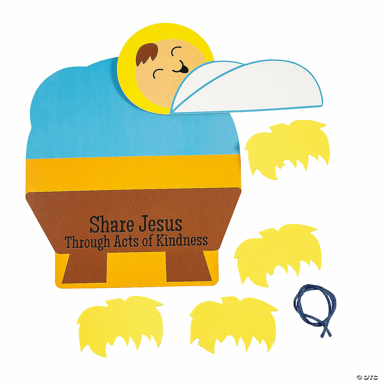 Help Sunday School kids understand that any time they show kindness, theyβre sharing Jesus with others! This fun and simple craft features a smiling Baby Jesus in a manger with the message βShare Jesus Through Acts of Kindnessβ along with ways to show kindness. For an interactive activity, ask children to brainstorm their own ways to show kindness and then write their ideas on the foam straw pieces. A great craft to accompany a lesson on living like Jesus, this peel-and-stick craft kit will be a favorite among kids. Includes self-adhesive foam pieces and satin cording. 7″ x 7 1/2″ Makes 12. All craft kit pieces are pre-packaged for individual use. Kits include instructions. Β© OTC