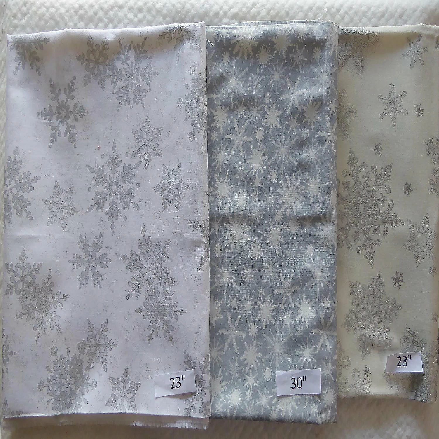 Our last of the best Collection Winter Snowflakes on Silver and White – 3 fabrics- Total of all the fabrics is 2 Yards 4 Inches. See the Picture for the individual measurements of each Fabric. Each one is 44 inches wide. 100 percent Premium Quality Cotton Fabric.