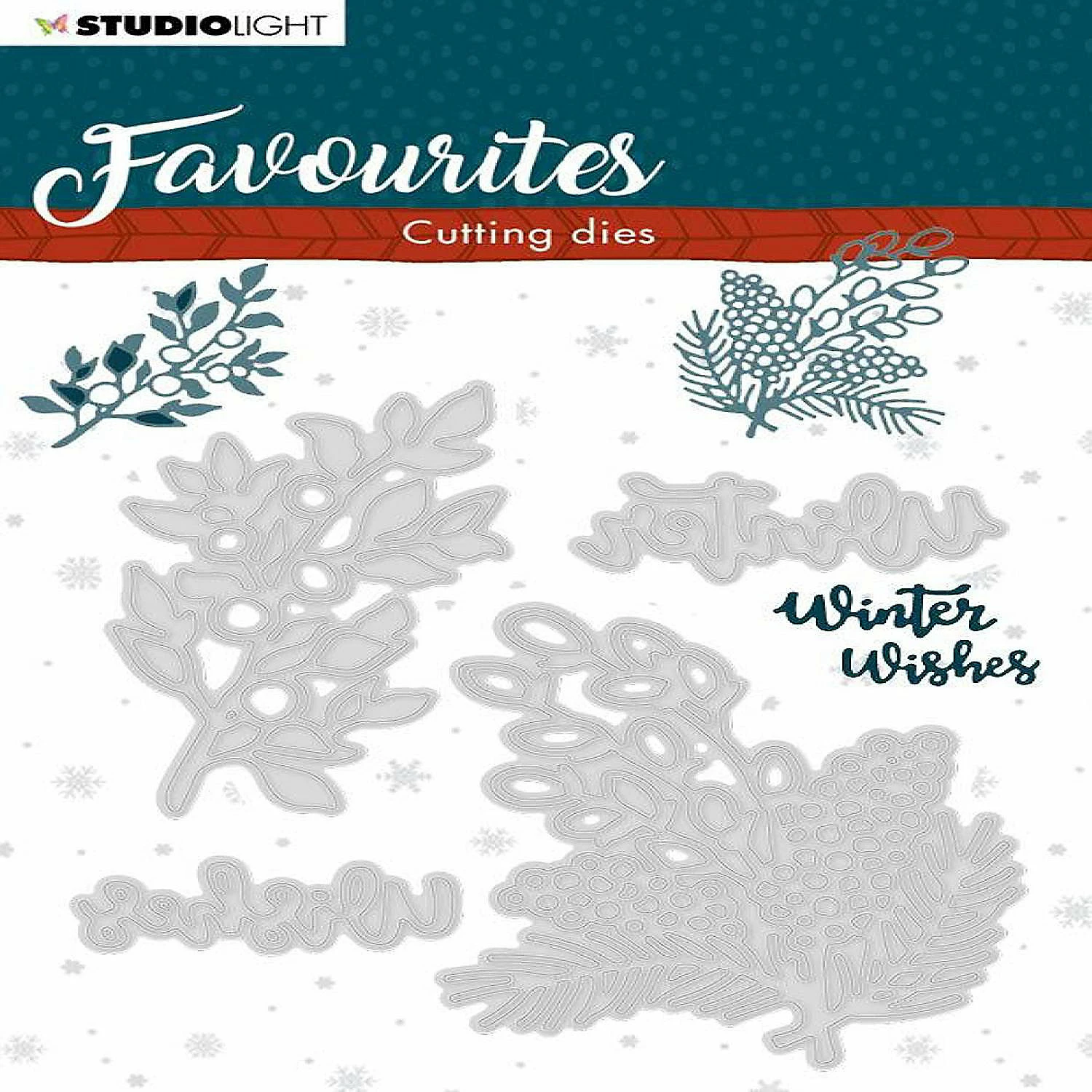 Studio Light Cutting Die Winter’s Favourites 105x155mm nr.336 A set of holiday dies that include Winter florals as well as the sentiment “Winter Wishes” Size: 4×6 inch die set.