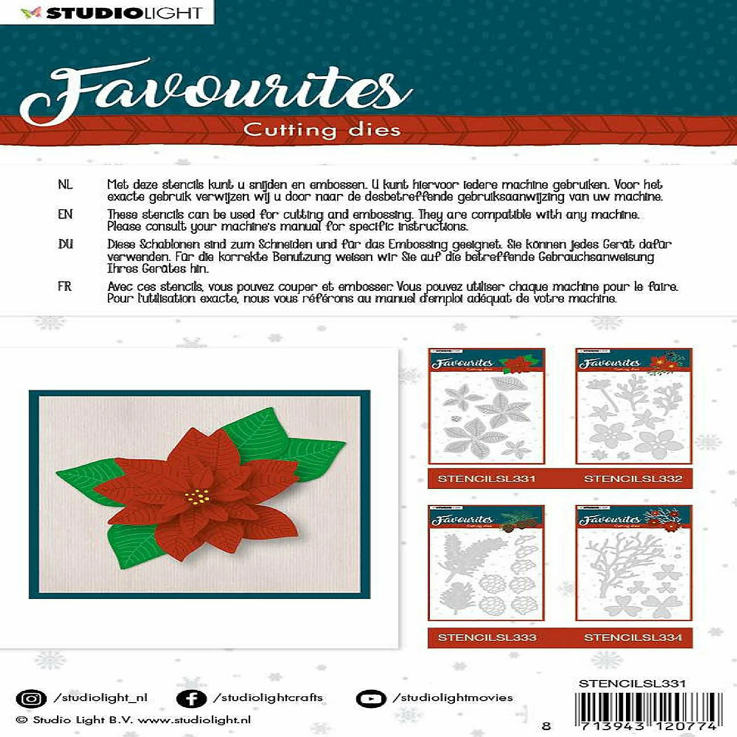 Studio Light Cutting Die Winter’s Favourites 110x118mm nr.331 Build a perfect poinsettia with this flower die from Studio Light. Includes four different sizes of petals, as well as a leaf to create the look you want. Size: 4×4.7 inch die set