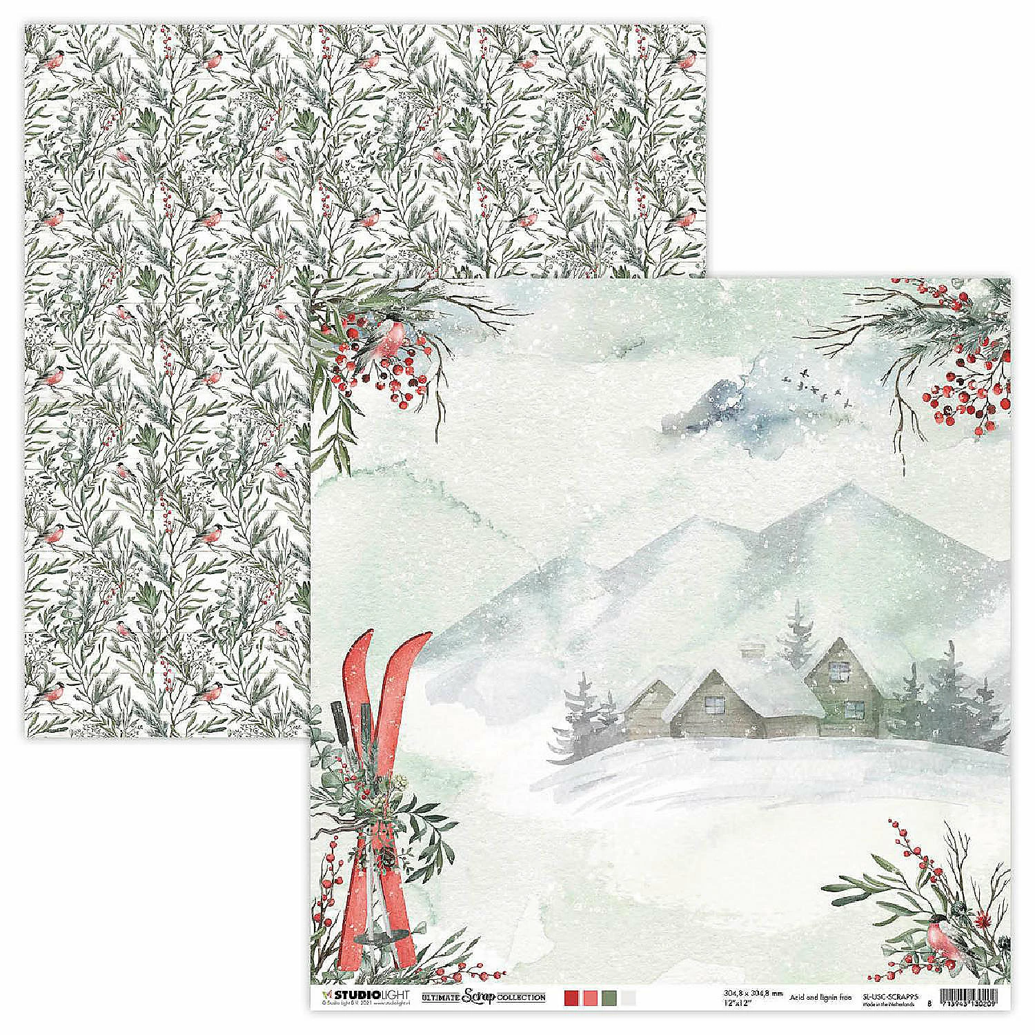 SL Scrap 200gr Ultimate Scrap Winter Collection 304.8×304.8×0.2mm 1 sh nr.95 A double sided piece of scrapbook paper featuring a Wintery scene with a house and mountains framed with winter berries, birds, skis and pine branches on one side and birds, red berries and branches on the other side. Use for scrapbook layouts, cardmaking and other paper craft projects. Weight 200gr. Size: 12×12 inches