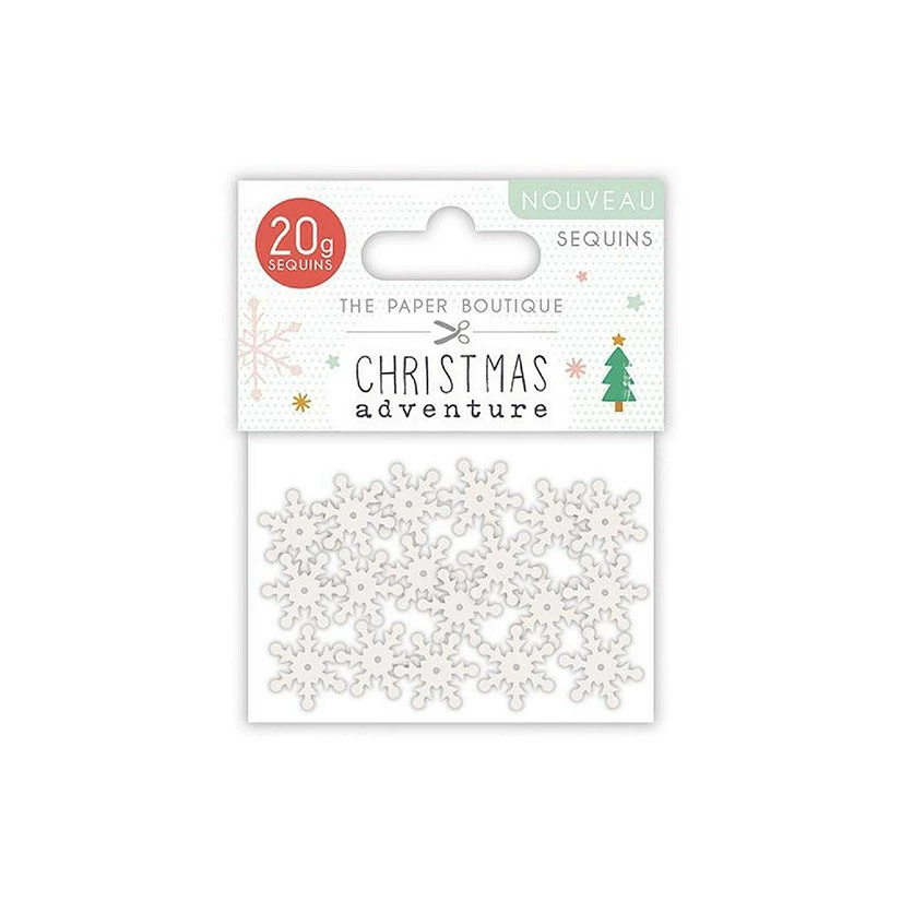 The Paper Boutique Christmas Adventure Sequins This collection of adventurous papers are a great mix of patterns and images, everything from hot chocolate to snowmen and penguins. The collection come with three sizes of paper pad, a project pad that is packed with 165 unique pieces, coordinating plain papers and an array of embellishments: β stars, bows, sequins, wooden snowflake shapes, photo frames, adhesive gems, pearls, mini bells. The small snowflake sequins come in a 20 gram packet. Paper Pad 12 x 12 inch (PB1523) 8 x 8 inch (PB1524), 6 x 6 inch (PB1525), 8 x 8 inch project pad (PB1526), 8 x 8 inch plain card (PB1527), Buttons (PB1528), Bows (PB1529), Sequins (PB1530), Wooden Shapes (PB1531), Photo Frames (PM1532), Adhesive Gems (PB1533), Adhesive Pearls (PB1534) and Mini Bells (PB1535). Made in the UK. Acid and lignin free. β’ great accompaniment to the papersβ’ soft colour palletβ’ 20 gram pack