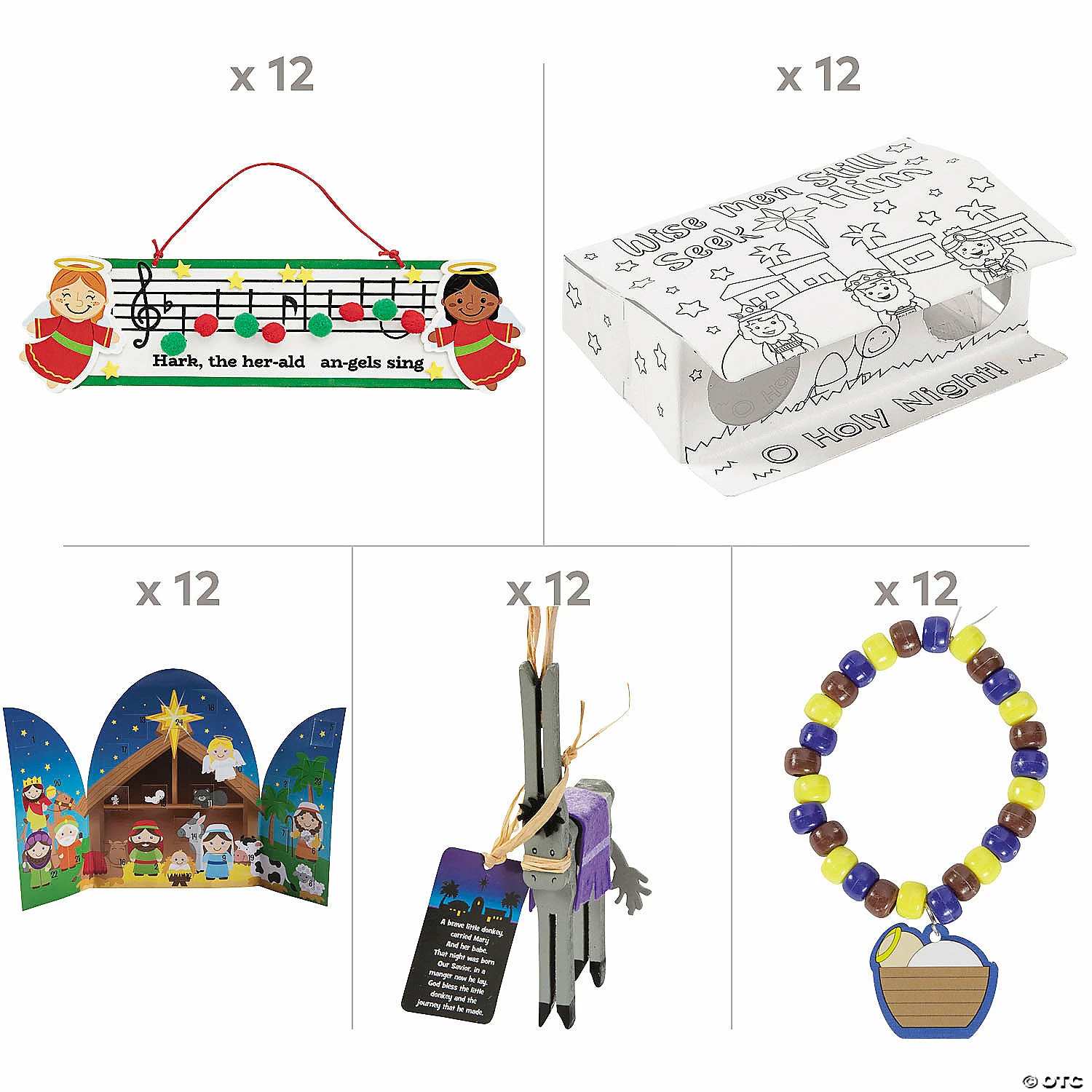 Help Sunday School kids learn to celebrate the real reason for the season with the help of these fun Christmas crafts. Each craft has a Christmas theme and helps tell the story of the Nativity. Each craft is easy and fun! Buy this assortment to prepare your Sunday School classroom for the holiday season. (60 pcs. per unit) Assortment may vary.Includes:β’ 12 Angels Sing Pom-Pom Craft Kits (Includes self-adhesive foam pieces, pom-poms and satin cording. 12 1/2″ x 3 1/2″)β’ 12 Cardstock Color Your Own Wise Men Seek Him Binoculars (4″ x 2 3/4″ Simple assembly required. For novelty use only.)β’ 12 Legend of the Donkey Clothespin Ornament Craft Kits (Includes wooden clothespins, felt and foam pieces, raffia and a 1 1/2″ x 2 1/2″ paper card that explains the religious symbolism of the donkey. 6″)β’ 12 Cardstock Nativity Advent Calendars (18″ x 11 3/4″)β’ 12 Nativity Charm Bracelet Craft Kits (Includes 1/4″ plastic pony beads, 1″ chipboard charm and a 14″ stretchy cord.)