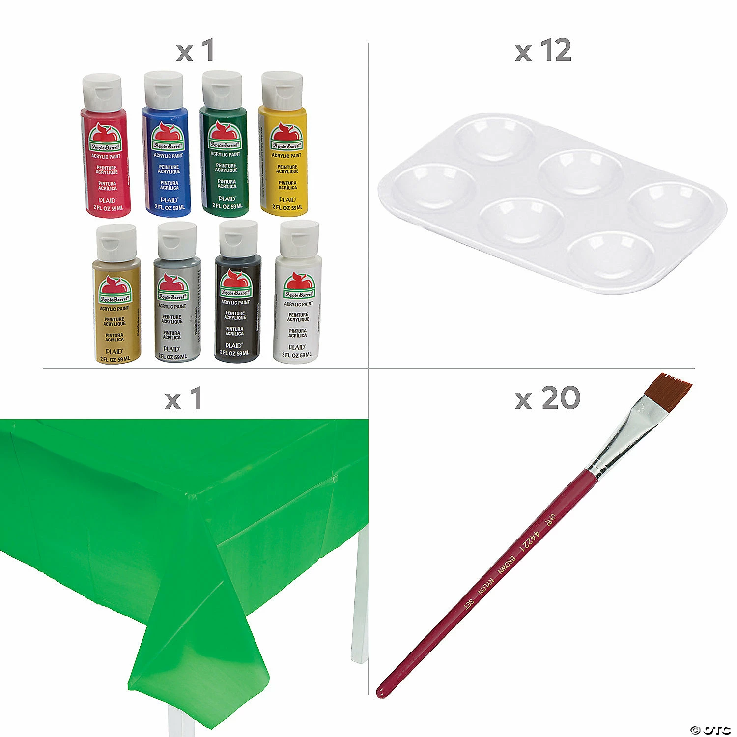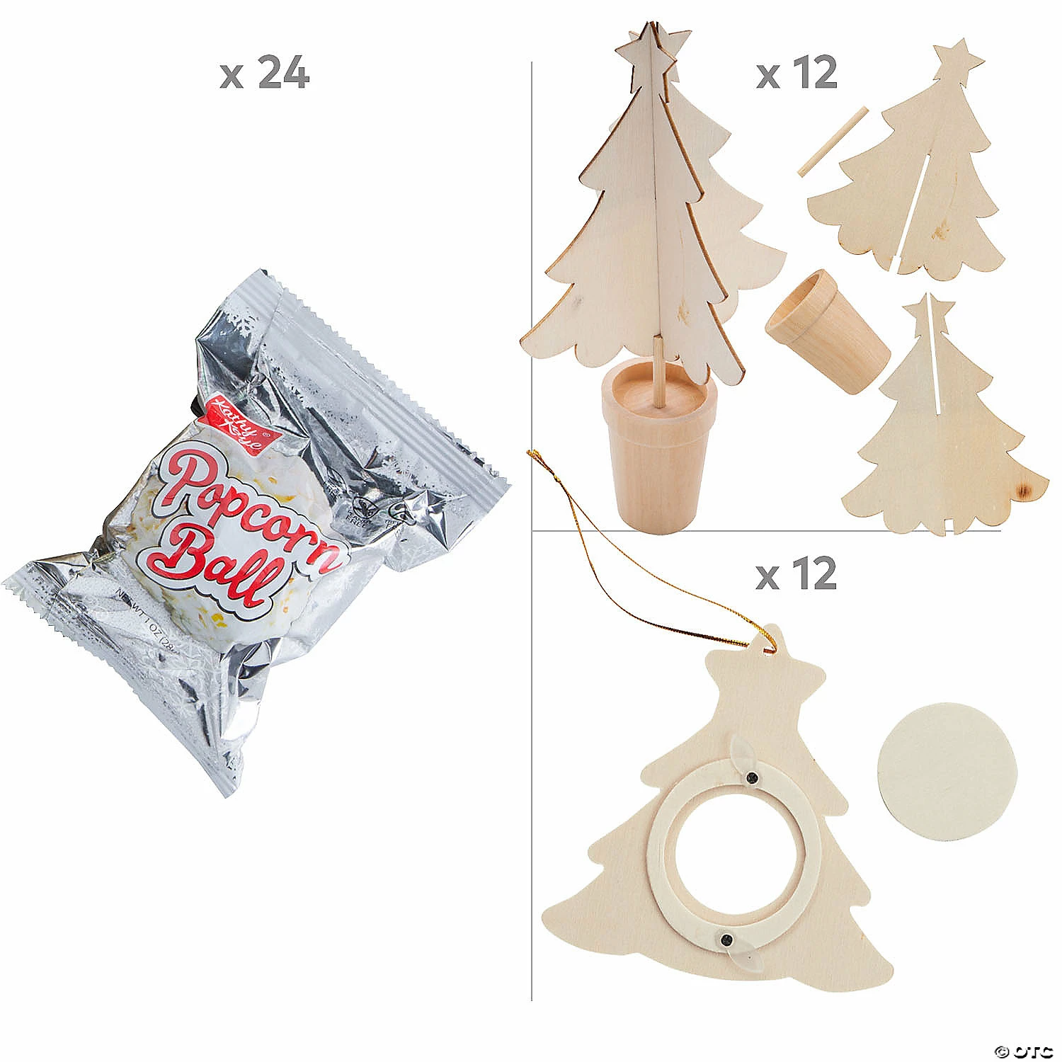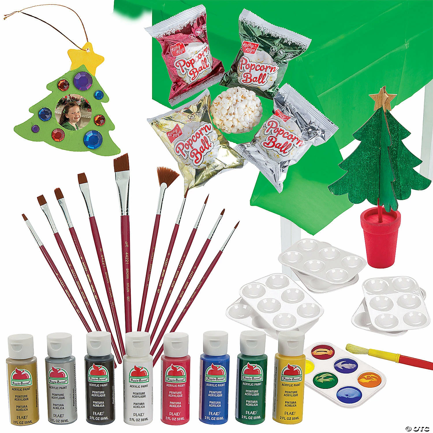 Enjoy a fun day of holiday crafting and snacking with this craft kit filled with art supplies, crafting projects and delicious cookie treats! This craft kit has everything needed for a fun crafting date. Get up to a dozen kids together for some crafting and snacking fun that will help make the holidays even more special. (95 pcs. per unit) Assortment may vary.Includes:• 8 Acrylic Paints (Includes 8 primary colors each in a 2-oz. plastic bottle. Safe and non-toxic. Conforms to ASTM D-4236.)• 12 DIY Unfinished Wood Christmas Tree Picture Frame Ornaments (4 1/2″ x 4 1/2″ with a 1 1/2″ photo space.)• 12 DIY Unfinished Wood Potted Christmas Trees (4″ x 7″)• 1 Plastic Green Tablecloth (54″ x 108″ Thin, slightly transparent. Disposable.)• 12 Plastic Rectangular Paint Palettes (5 1/4″ x 3 3/4″)• 20 Wooden Plaid® Brown Nylon Paintbrushes (6 7/8″ – 7 7/8″)• 24 Christmas Popcorn Balls (Total wt., 1 lb)
