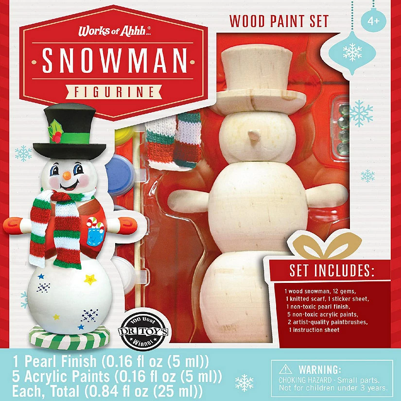 This Snowman Wood Craft & Paint Kit is made of real wood, and includes everything you need to create a beautiful work of art! The Snowman Wood Craft & Paint Kit is the perfect gift for every art loving kid! It includes 1 wood snowman, 12 gem stones, 1 knitted scarf, 1 sticker sheet, 1 non-toxic pearl finish, 5 non-toxic acrylic paint tubs, 2 artist-quality paintbrushes, and 1 instruction sheet with painting guide.
