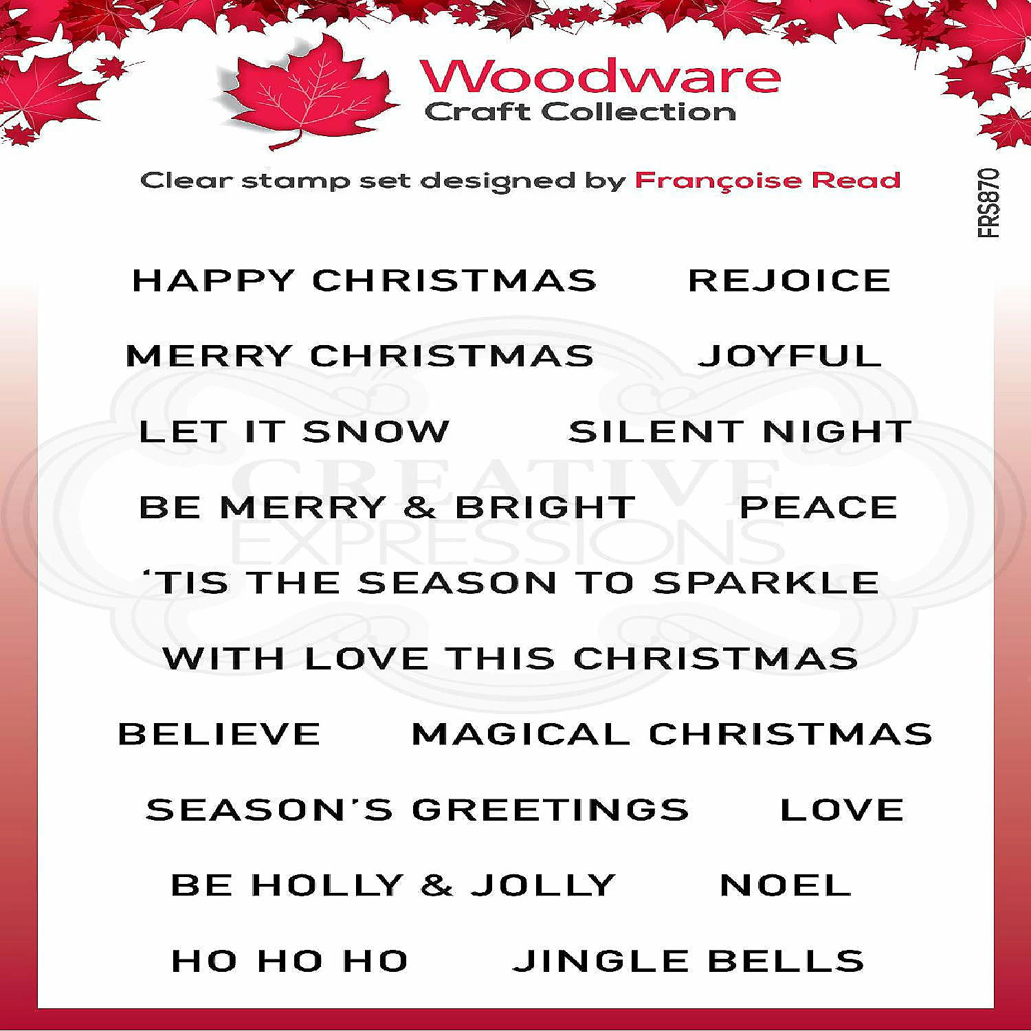 Woodware Clear Singles Christmas Strips 4 in x 6 in Stamp This bumper eighteen stamps set is a stash must have for all your Christmas wording, in a contemporary block capital style Designed by Francoise Read. These stamps would be perfect for cards and scrapbook pages as well as mixed media or Christmas dΓ©cor projects. Ready to mount on an acrylic block the stamps can be used with ink pads, paint, or used with pigment ink and embossing powder. Clean your stamps with a wipe, damp cloth or under warm running water depending on the medium you use. They are suitable for use on paper, fabric, or any other surface depending on the ink choice. Designed and made in the United Kingdom. 15.25 x 10.15 cm (6 x 4-inch) β 18 stamp set β’ Designed by Francoise Readβ’ Great for a bold finishing touchβ’ eighteen stamp set